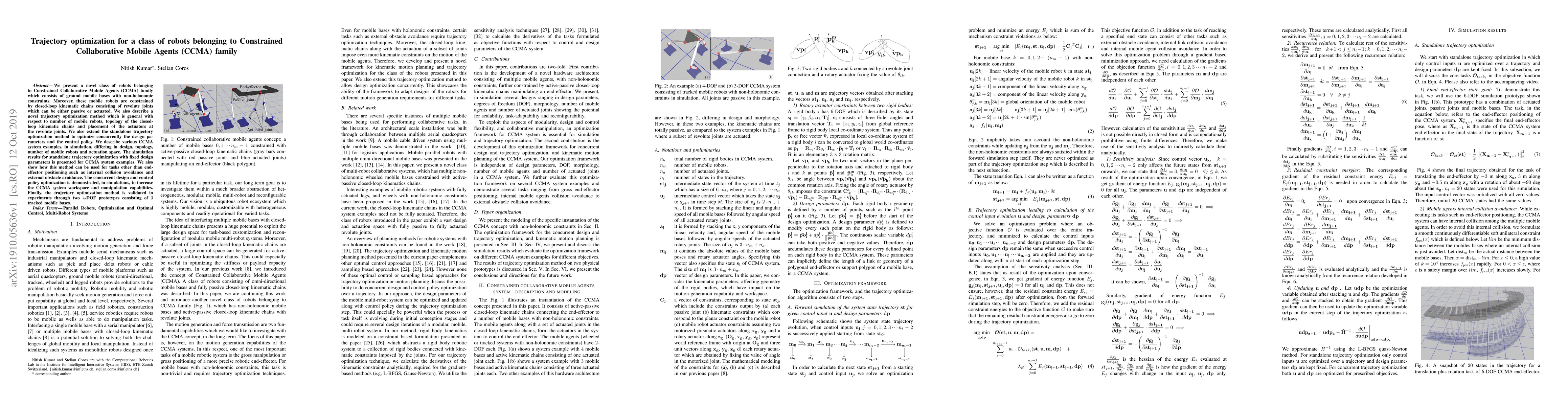 We present a novel class of robots belonging to Constrained Collaborative Mobile Agents (CCMA) family which consists of ground mobile bases with non-holonomic constraints. Moreover, these mobile robots are constrained by closed-loop kinematic chains consisting of revolute joints which can be either passive or actuated. We also describe a novel trajectory optimization method which is general with respect to number of mobile robots, topology of the closed-loop kinematic chains and placement of the actuators at the revolute joints. We also extend the standalone trajectory optimization method to optimize concurrently the design parameters and the control policy. We describe various CCMA system examples, in simulation, differing in design, topology, number of mobile robots and actuation space. The simulation results for standalone trajectory optimization with fixed design parameters is presented for CCMA system examples. We also show how this method can be used for tasks other than end-effector positioning such as internal collision avoidance and external obstacle avoidance. The concurrent design and control policy optimization is demonstrated, in simulations, to increase the CCMA system workspace and manipulation capabilities. Finally, the trajectory optimization method is validated in experiments through two 4-DOF prototypes consisting of 3 tracked mobile bases.