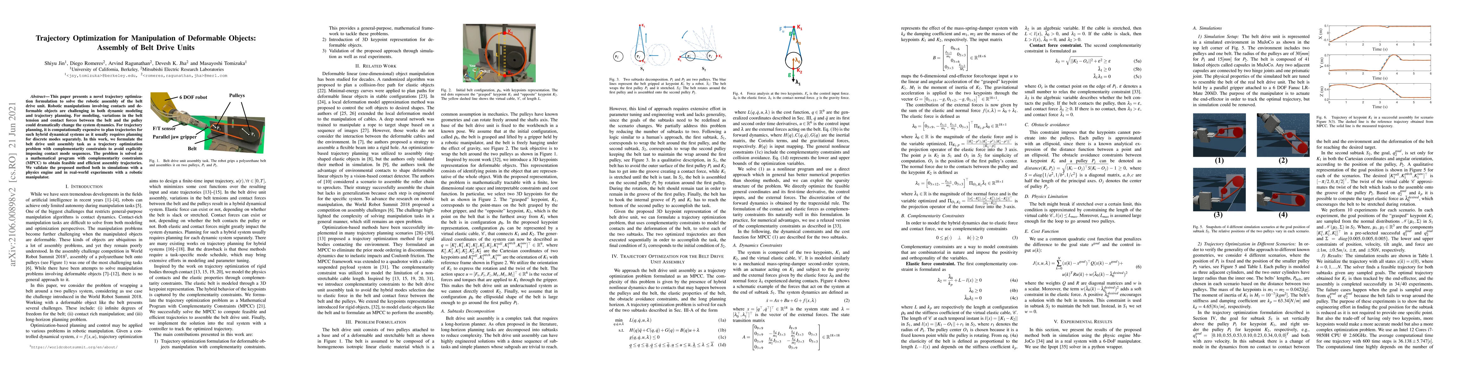 Researchers developed a new method to optimize assembly trajectories for robotic manipulation of deformable objects, like belt drive units, using complementarity constraints. The approach improves efficiency and feasibility in planning for complex hybrid dynamical systems.