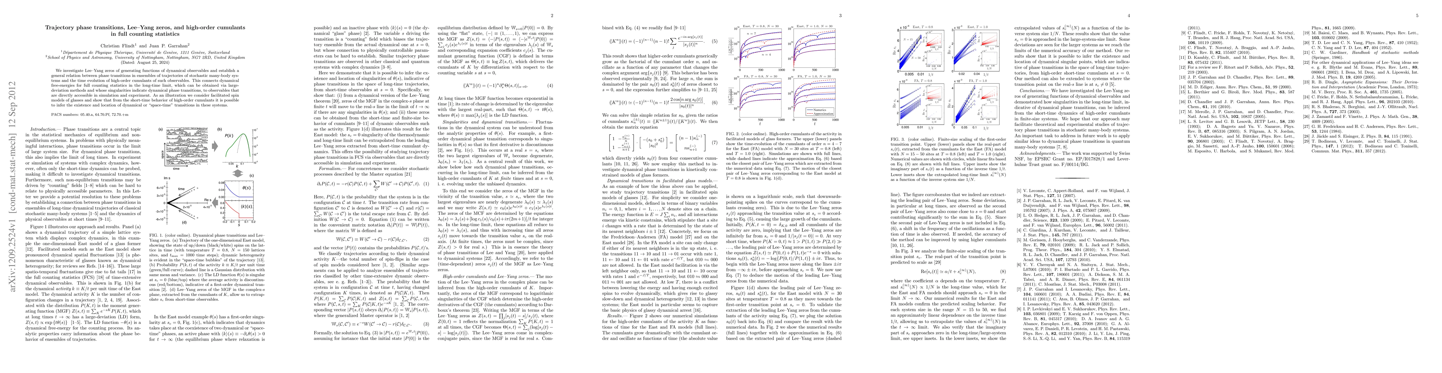 This paper establishes a connection between phase transitions in stochastic many-body systems and the time evolution of high-order cumulants, using Lee-Yang zeros to link dynamical free-energies in full counting statistics to observable quantities. It demonstrates this through facilitated spin models of glasses, showing how short-time behavior of cumulants can reveal dynamical phase transitions.