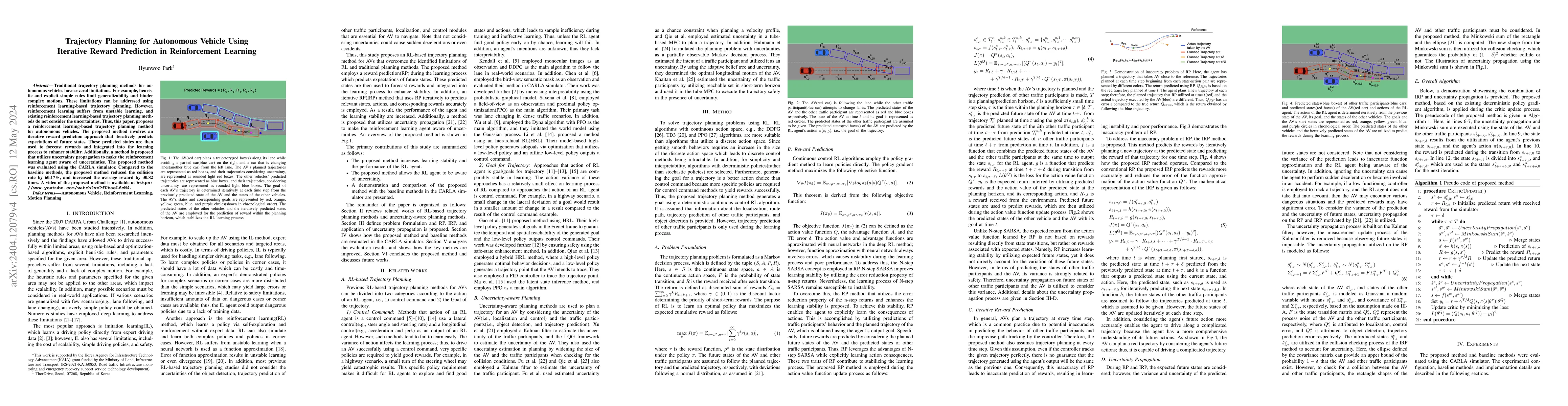 This paper proposes a reinforcement learning-based trajectory planning method for autonomous vehicles that uses an iterative reward prediction approach to enhance stability and incorporate uncertainty propagation, resulting in a 60.17% reduction in collisions and a 30.82 times increase in average reward compared to baseline methods.