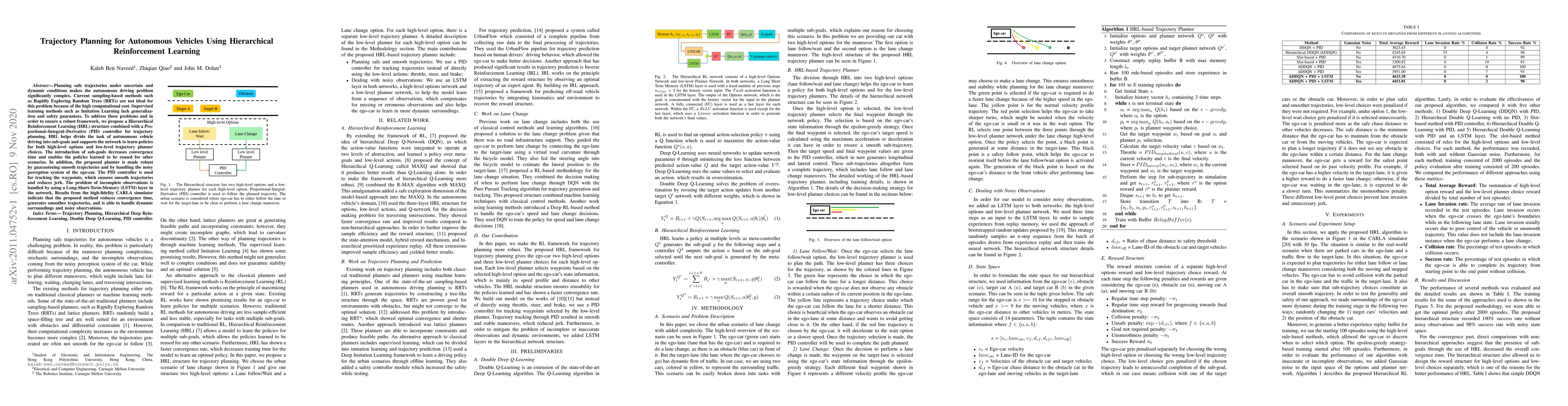 This paper proposes a Hierarchical Reinforcement Learning (HRL) structure combined with a PID controller for efficient and safe autonomous vehicle trajectory planning. The HRL approach divides driving tasks into sub-goals, improving convergence time and policy reuse while ensuring smooth trajectories and handling dynamic environments and noisy observations.