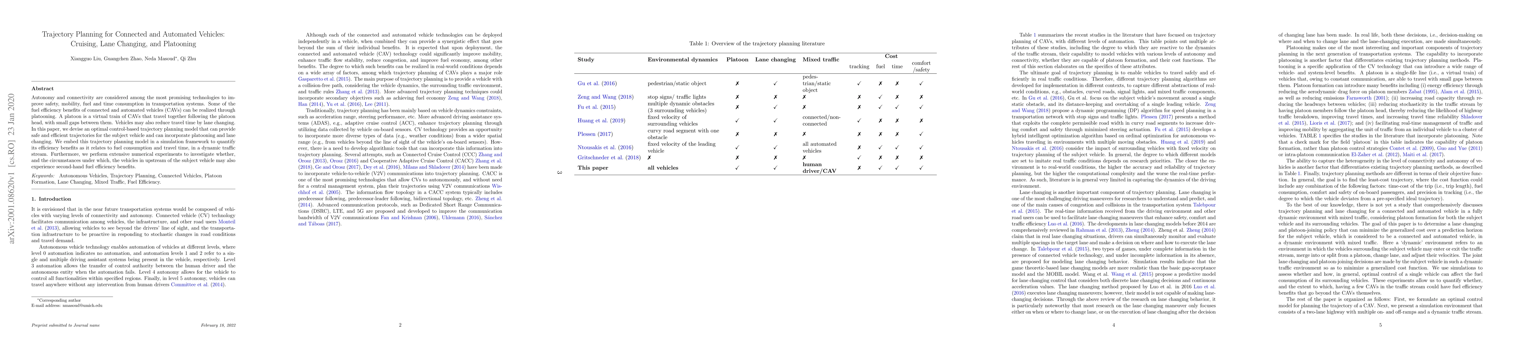 This paper develops an optimal control-based trajectory planning model for connected and automated vehicles to optimize cruising, lane changing, and platooning for improved safety and efficiency. Simulation results show that the model reduces fuel consumption and travel time, and upstream vehicles may also benefit from secondary fuel efficiency gains.