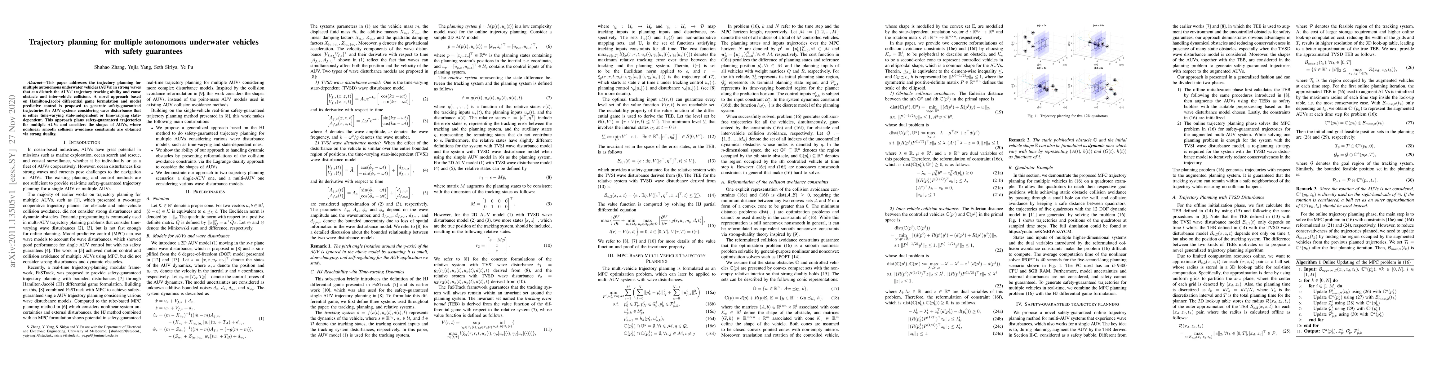 This paper proposes a novel trajectory planning method for multiple autonomous underwater vehicles (AUVs) using Hamilton-Jacobi differential game formulation and model predictive control to ensure safety in strong wave conditions, accounting for time-varying disturbances and nonlinear collision avoidance.