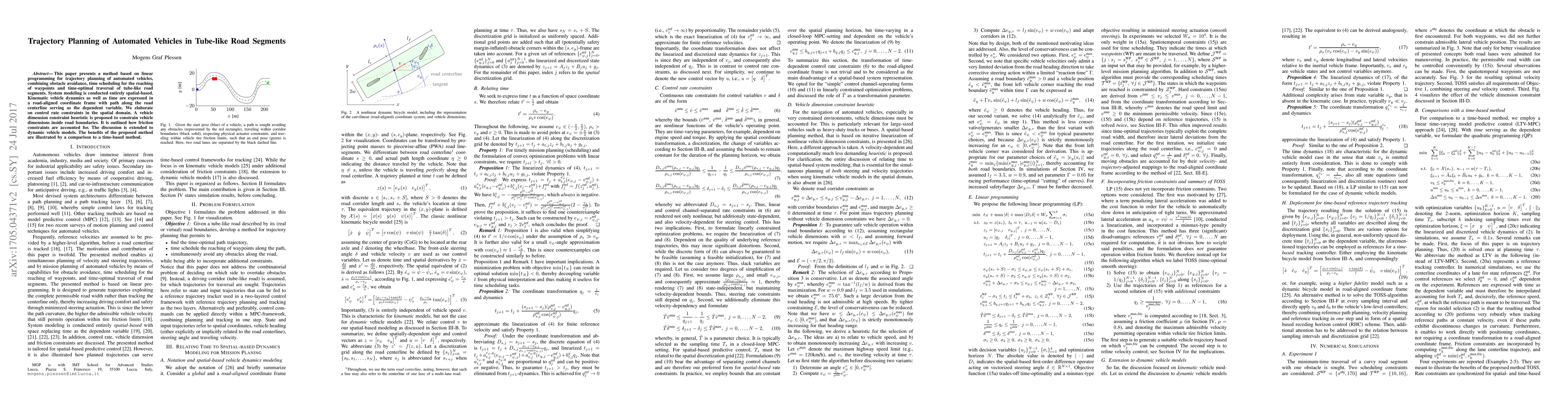 This paper proposes a linear programming-based method for automated vehicle trajectory planning in tube-like road segments, integrating obstacle avoidance, time scheduling, and optimal traversal. The spatial-based system modeling considers kinematic dynamics and friction constraints, with a heuristic for vehicle dimension constraints.