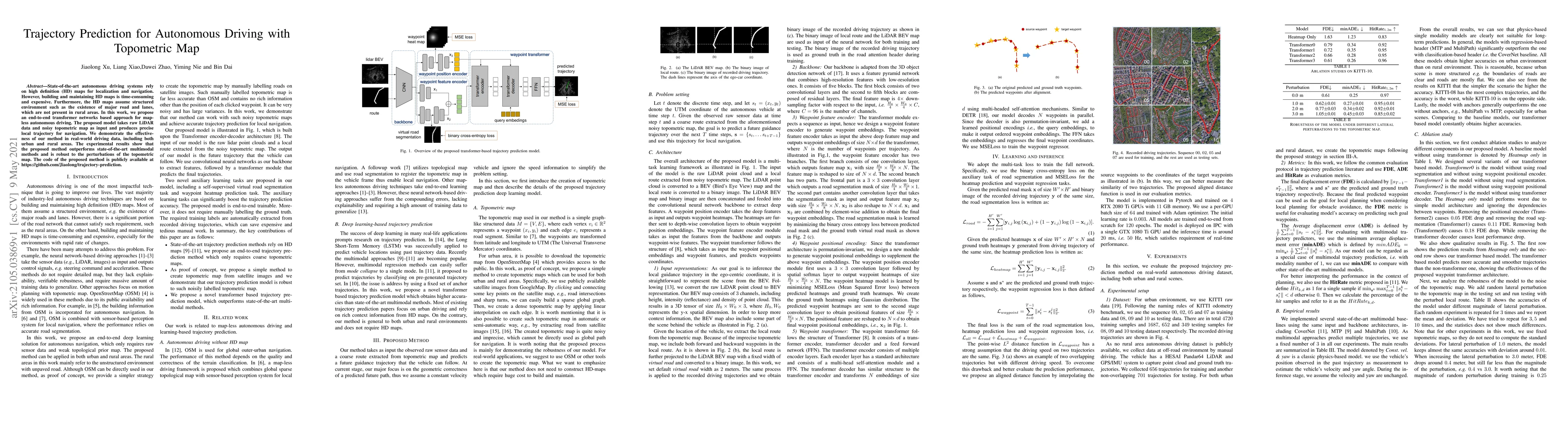 State-of-the-art autonomous driving systems rely on high definition (HD) maps for localization and navigation. However, building and maintaining HD maps is time-consuming and expensive. Furthermore, the HD maps assume structured environment such as the existence of major road and lanes, which are not present in rural areas. In this work, we propose an end-to-end transformer networks based approach for map-less autonomous driving. The proposed model takes raw LiDAR data and noisy topometric map as input and produces precise local trajectory for navigation. We demonstrate the effectiveness of our method in real-world driving data, including both urban and rural areas. The experimental results show that the proposed method outperforms state-of-the-art multimodal methods and is robust to the perturbations of the topometric map. The code of the proposed method is publicly available at \url{https://github.com/Jiaolong/trajectory-prediction}.