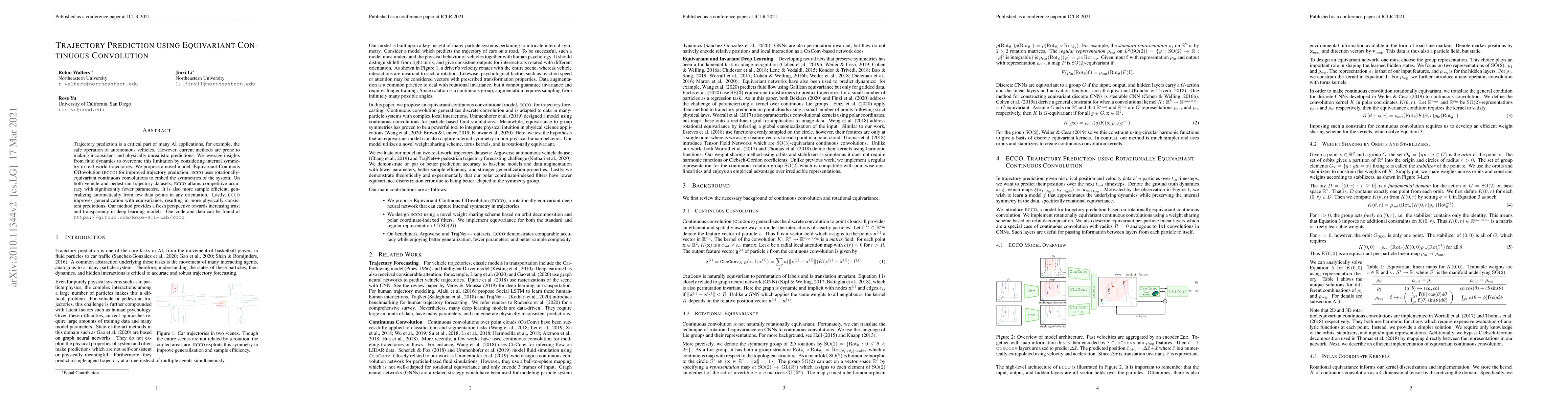 Trajectory prediction is a critical part of many AI applications, for example, the safe operation of autonomous vehicles. However, current methods are prone to making inconsistent and physically unrealistic predictions. We leverage insights from fluid dynamics to overcome this limitation by considering internal symmetry in real-world trajectories. We propose a novel model, Equivariant Continous COnvolution (ECCO) for improved trajectory prediction. ECCO uses rotationally-equivariant continuous convolutions to embed the symmetries of the system. On both vehicle and pedestrian trajectory datasets, ECCO attains competitive accuracy with significantly fewer parameters. It is also more sample efficient, generalizing automatically from few data points in any orientation. Lastly, ECCO improves generalization with equivariance, resulting in more physically consistent predictions. Our method provides a fresh perspective towards increasing trust and transparency in deep learning models.