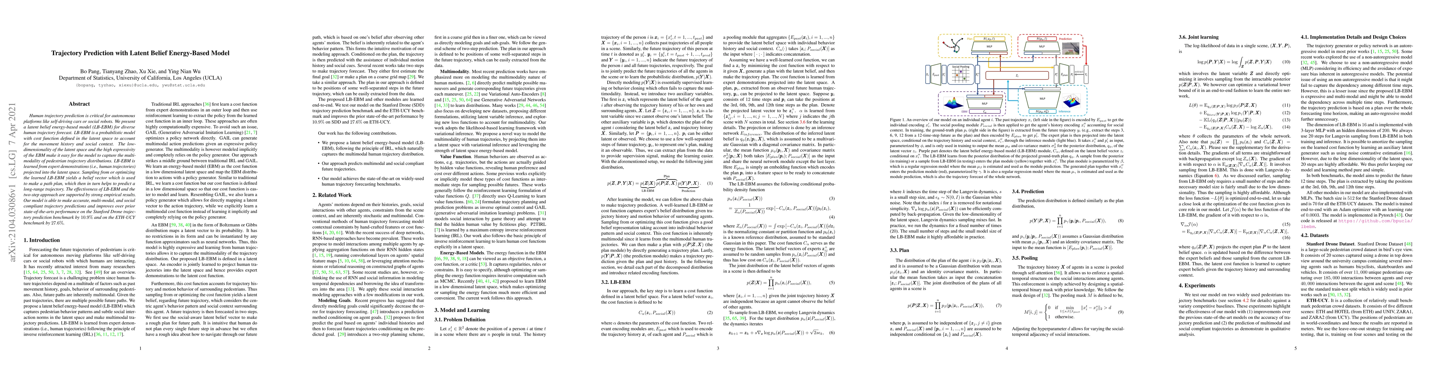 This paper introduces a latent belief energy-based model (LB-EBM) for predicting diverse human trajectories, leveraging a probabilistic framework with a cost function in latent space to account for movement history and social context. The model outperforms prior methods on trajectory prediction benchmarks, achieving a 10.9% improvement on the Stanford Drone dataset and a 27.6% improvement on the ETH-UCY dataset.