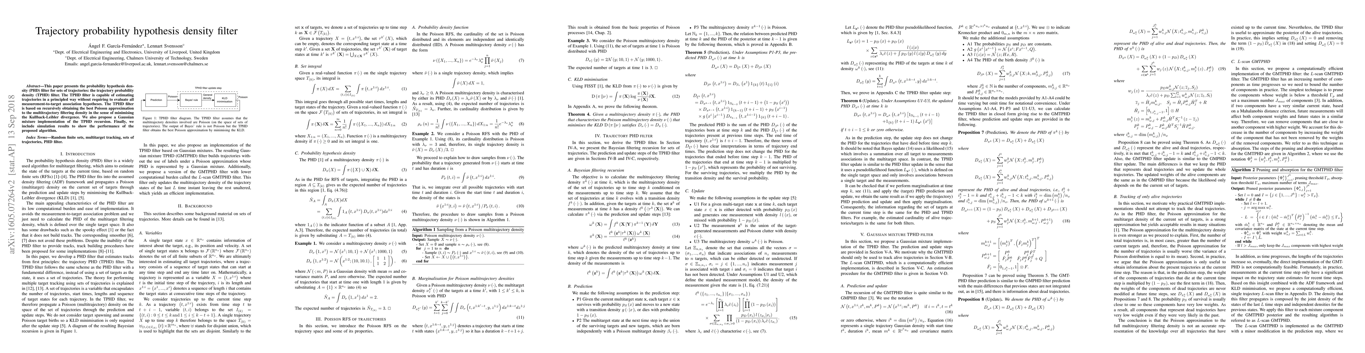 The paper introduces the Trajectory Probability Hypothesis Density (TPHD) filter, which estimates trajectories without exhaustive association hypotheses, using a recursive Poisson approximation to minimize Kullback-Leibler divergence. A Gaussian mixture implementation is also proposed, and simulation results demonstrate its performance.