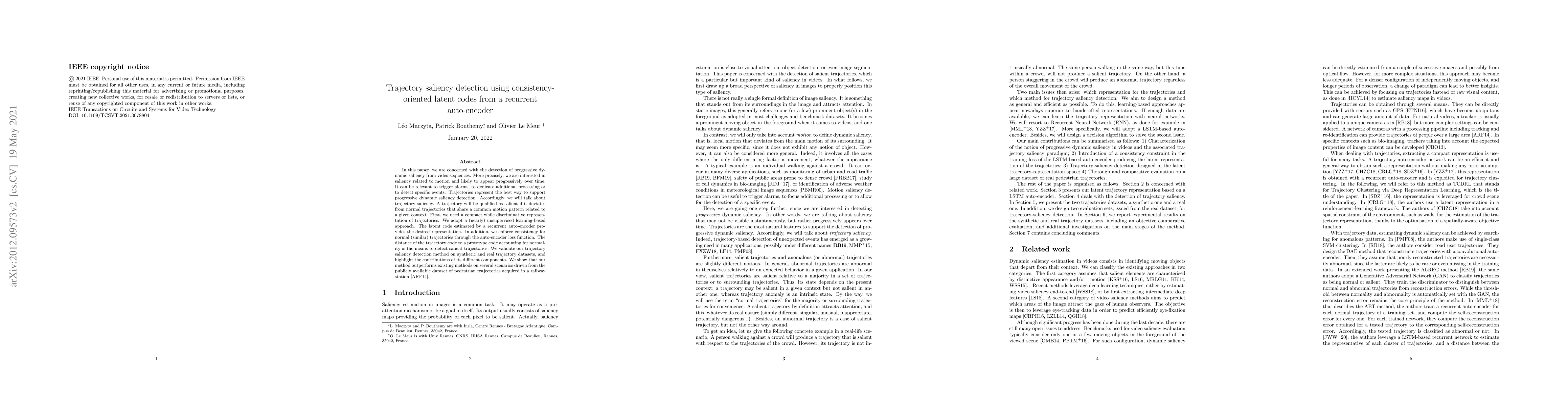 In this paper, we are concerned with the detection of progressive dynamic saliency from video sequences. More precisely, we are interested in saliency related to motion and likely to appear progressively over time. It can be relevant to trigger alarms, to dedicate additional processing or to detect specific events. Trajectories represent the best way to support progressive dynamic saliency detection. Accordingly, we will talk about trajectory saliency. A trajectory will be qualified as salient if it deviates from normal trajectories that share a common motion pattern related to a given context. First, we need a compact while discriminative representation of trajectories. We adopt a (nearly) unsupervised learning-based approach. The latent code estimated by a recurrent auto-encoder provides the desired representation. In addition, we enforce consistency for normal (similar) trajectories through the auto-encoder loss function. The distance of the trajectory code to a prototype code accounting for normality is the means to detect salient trajectories. We validate our trajectory saliency detection method on synthetic and real trajectory datasets, and highlight the contributions of its different components. We show that our method outperforms existing methods on several scenarios drawn from the publicly available dataset of pedestrian trajectories acquired in a railway station (Alahi 2014).