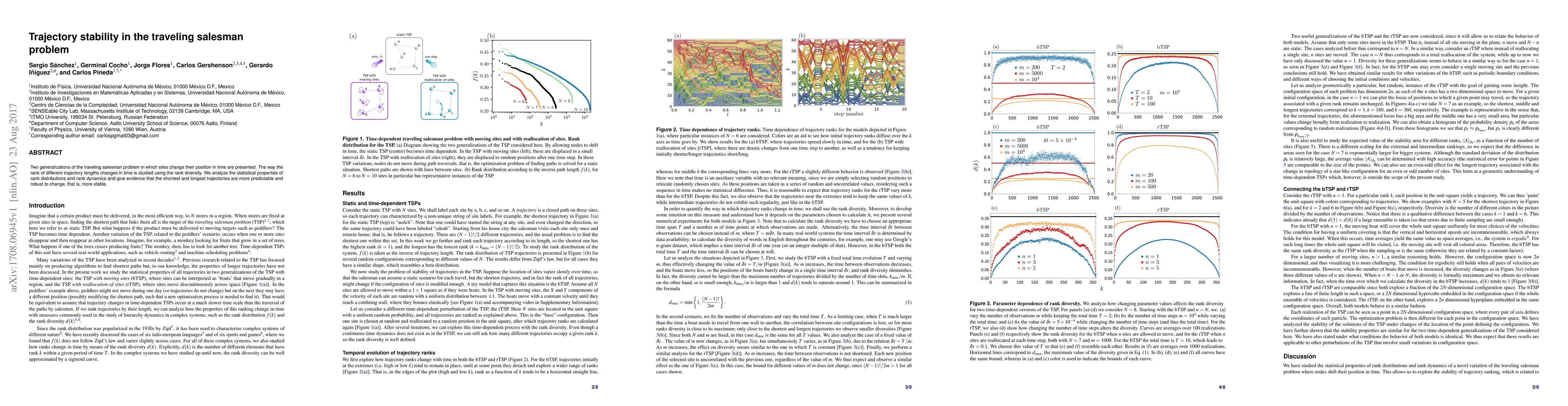 This paper investigates two dynamic versions of the traveling salesman problem, analyzing the stability of trajectory lengths over time through rank diversity. It finds that the shortest and longest routes are more predictable and robust, indicating greater stability despite changes in site positions.