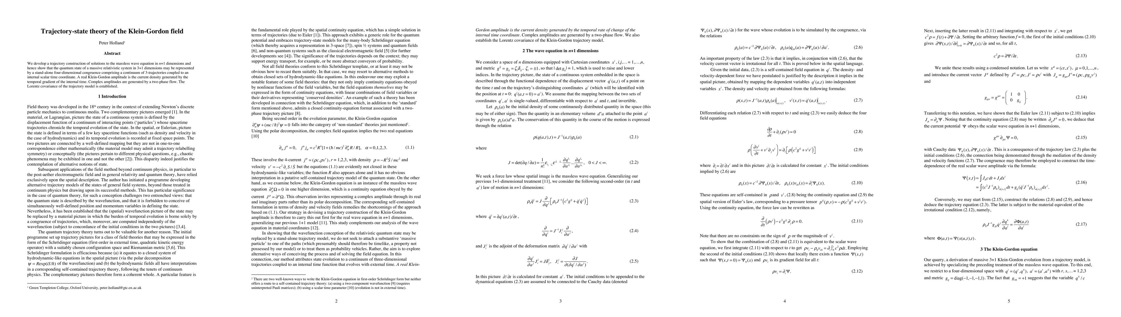 We develop a trajectory construction of solutions to the massless wave equation in n+1 dimensions and hence show that the quantum state of a massive relativistic system in 3+1 dimensions may be represented by a stand-alone four-dimensional congruence comprising a continuum of 3-trajectories coupled to an internal scalar time coordinate. A real Klein-Gordon amplitude is the current density generated by the temporal gradient of the internal time. Complex amplitudes are generated by a two-phase flow. The Lorentz covariance of the trajectory model is established.