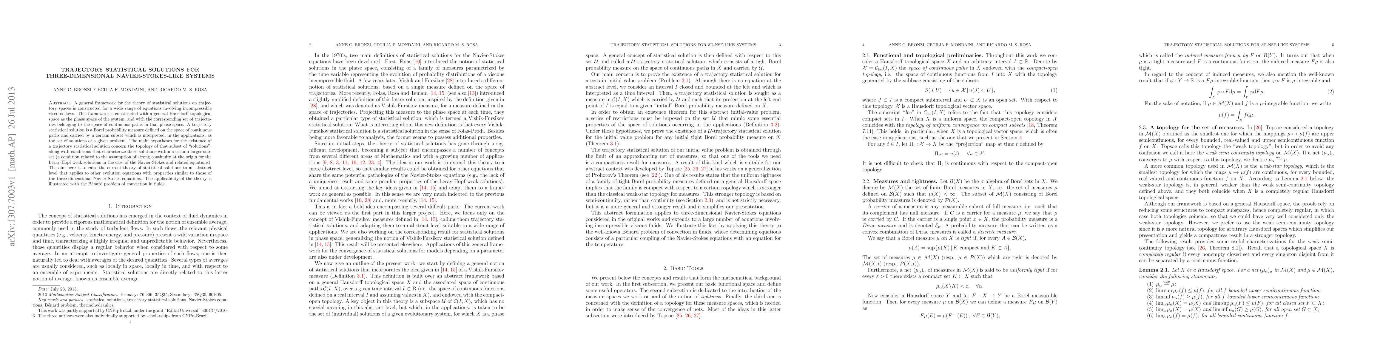 A general framework for the theory of statistical solutions on trajectory spaces is constructed for a wide range of equations involving incompressible viscous flows. This framework is constructed with a general Hausdorff topological space as the phase space of the system, and with the corresponding set of trajectories belonging to the space of continuous paths in that phase space. A trajectory statistical solution is a Borel probability measure defined on the space of continuous paths and carried by a certain subset which is interpreted, in the applications, as the set of solutions of a given problem. The main hypotheses for the existence of a trajectory statistical solution concern the topology of that subset of "solutions", along with conditions that characterize those solutions within a certain larger subset (a condition related to the assumption of strong continuity at the origin for the Leray-Hopf weak solutions in the case of the Navier-Stokes and related equations). The aim here is to raise the current theory of statistical solutions to an abstract level that applies to other evolution equations with properties similar to those of the three-dimensional Navier-Stokes equations. The applicability of the theory is illustrated with the B\'enard problem of convection in fluids.
