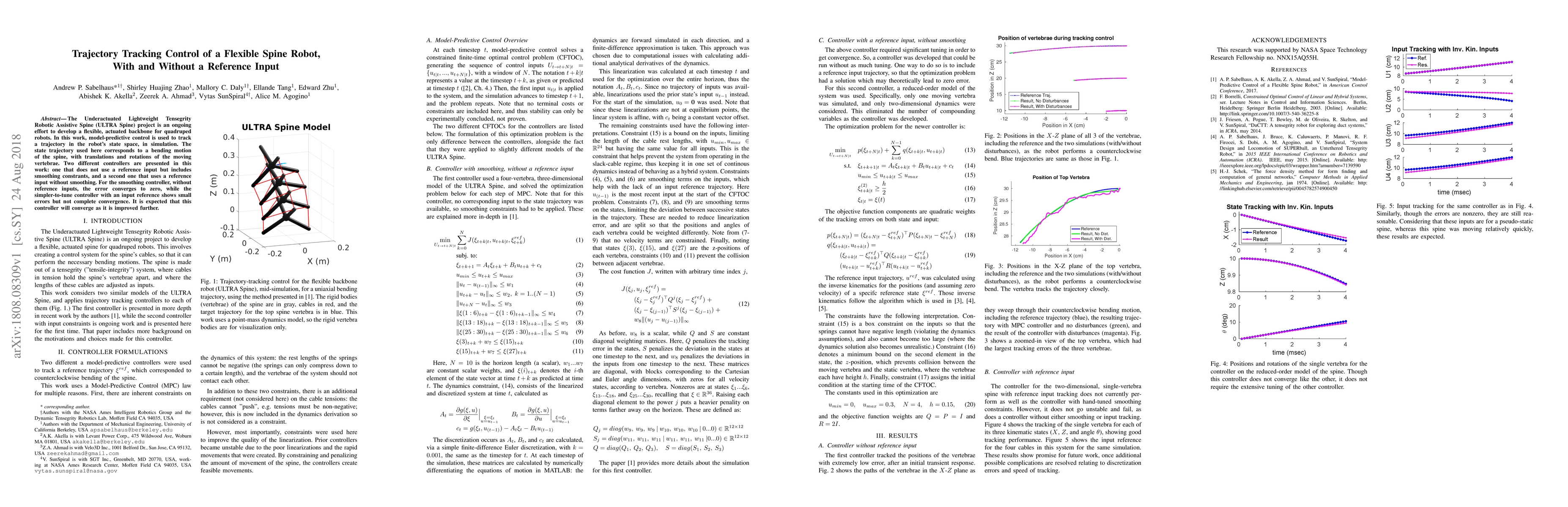 This paper explores model-predictive control for trajectory tracking in a flexible spine robot, comparing two controllers: one with smoothing constraints and no reference input, and another with a reference input but no smoothing. The former achieves zero error convergence, while the latter shows small errors but not complete convergence.