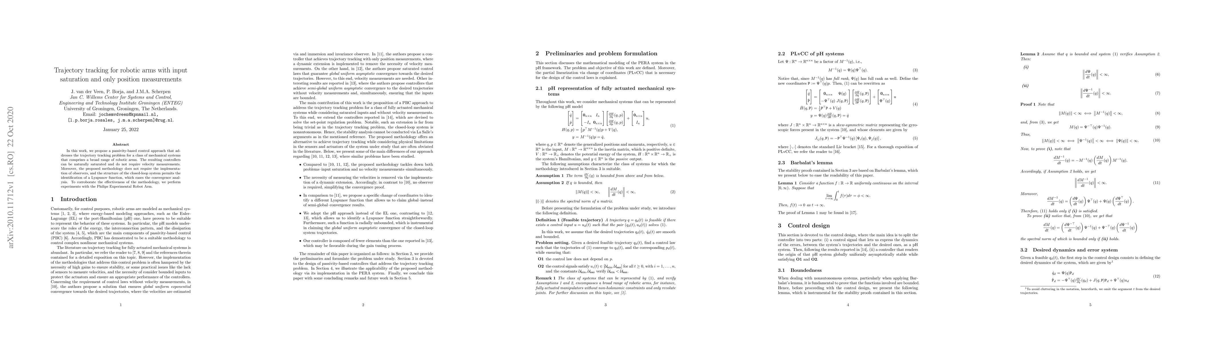 The paper presents a passivity-based control method for robotic arms that can track trajectories with input saturation and only position measurements, eliminating the need for velocity sensors or observers. The approach is validated through experiments with the Philips Experimental Robot Arm.