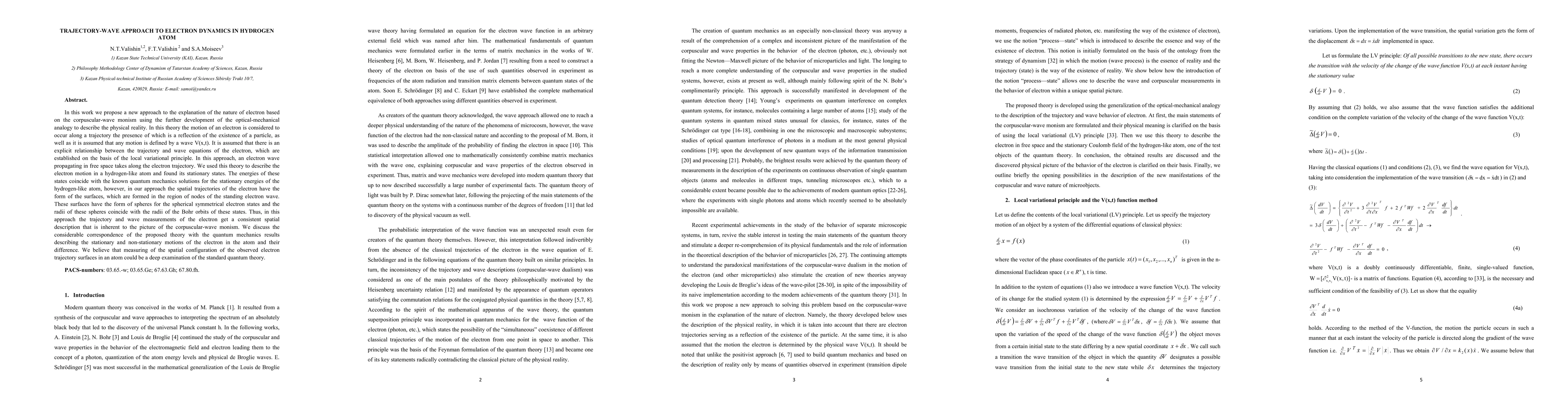 In this work we propose a new approach to the explanation of the nature of electron based on the corpuscular-wave monism using the further development of the optical-mechanical analogy to describe the physical reality. In this theory the motion of an electron is considered to occur along a trajectory the presence of which is a reflection of the existence of a particle, as well as it is assumed that any motion is defined by a wave V(x,t). It is assumed that there is an explicit relationship between the trajectory and wave equations of the electron, which are established on the basis of the local variational principle. In this approach, an electron wave propagating in free space takes along the electron trajectory. We used this theory to describe the electron motion in a hydrogen-like atom and found its stationary states. The energies of these states coincide with the known quantum mechanics solutions for the stationary energies of the hydrogen-like atom, however, in our approach the spatial trajectories of the electron have the form of the surfaces, which are formed in the region of nodes of the standing electron wave. These surfaces have the form of spheres for the spherical symmetrical electron states and the radii of these spheres coincide with the radii of the Bohr orbits of these states. Thus, in this approach the trajectory and wave measurements of the electron get a consistent spatial description that is inherent to the picture of the corpuscular-wave monism. We discuss the considerable correspondence of the proposed theory with the quantum mechanics results describing the stationary and non-stationary motions of the electron in the atom and their difference. We believe that measuring of the spatial configuration of the observed electron trajectory surfaces in an atom could be a deep examination of the standard quantum theory.