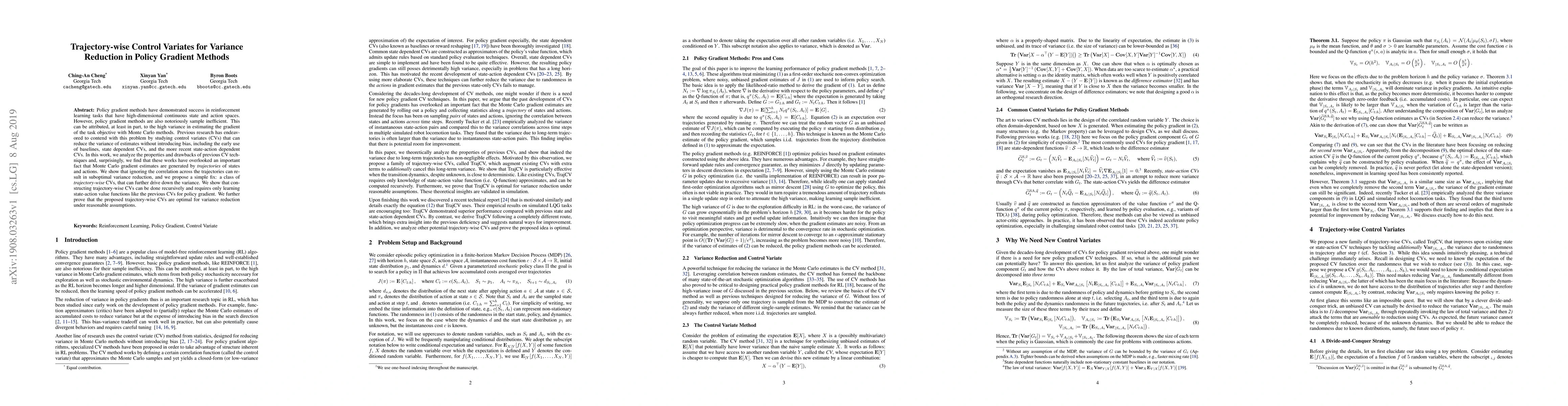 This paper proposes "trajectory-wise" control variates to enhance variance reduction in policy gradient methods, addressing the inefficiencies of previous control variate techniques. The authors argue that previous methods overlook trajectory correlations, leading to suboptimal variance reduction and suggest that incorporating these correlations with trajectory-wise CVs can achieve better variance reduction.