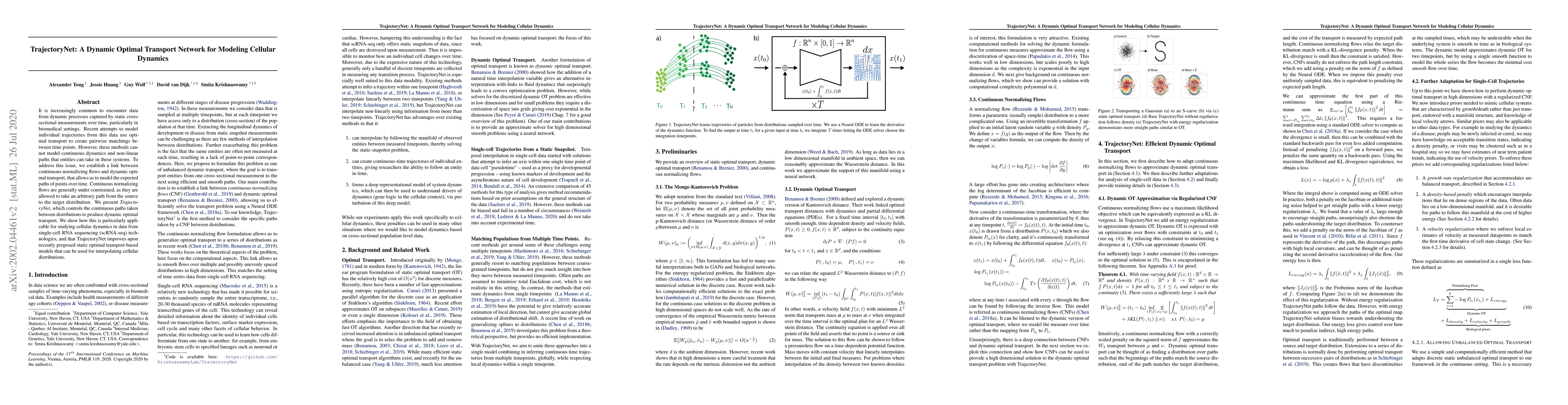 TrajectoryNet integrates continuous normalizing flows with dynamic optimal transport to model the continuous, non-linear paths of cellular dynamics over time, outperforming static optimal transport-based models for single-cell RNA sequencing data.