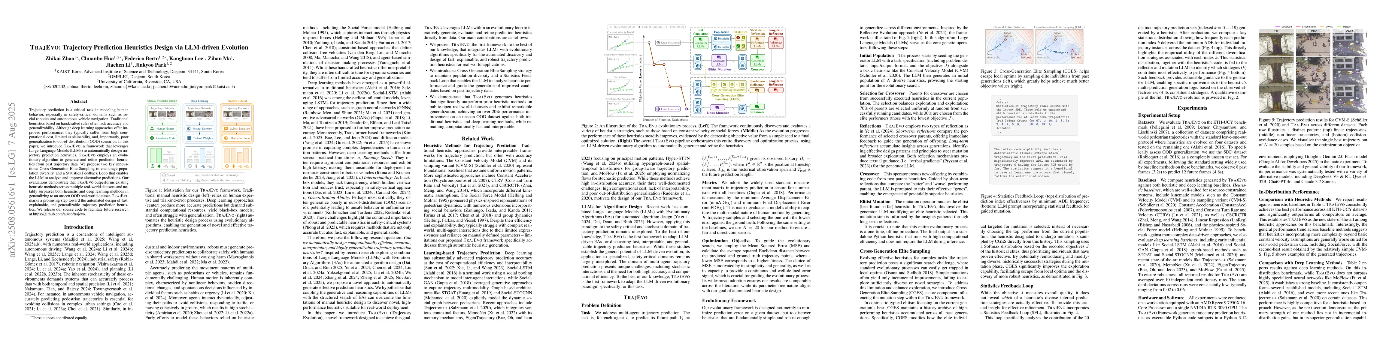 Trajectory prediction is a critical task in modeling human behavior, especially in safety-critical domains such as social robotics and autonomous vehicle navigation. Traditional heuristics based on handcrafted rules often lack accuracy and generalizability. Although deep learning approaches offer improved performance, they typically suffer from high computational cost, limited explainability, and, importantly, poor generalization to out-of-distribution (OOD) scenarios. In this paper, we introduce TrajEvo, a framework that leverages Large Language Models (LLMs) to automatically design trajectory prediction heuristics. TrajEvo employs an evolutionary algorithm to generate and refine prediction heuristics from past trajectory data. We propose two key innovations: Cross-Generation Elite Sampling to encourage population diversity, and a Statistics Feedback Loop that enables the LLM to analyze and improve alternative predictions. Our evaluations demonstrate that TrajEvo outperforms existing heuristic methods across multiple real-world datasets, and notably surpasses both heuristic and deep learning methods in generalizing to an unseen OOD real-world dataset. TrajEvo marks a promising step toward the automated design of fast, explainable, and generalizable trajectory prediction heuristics. We release our source code to facilitate future research at https://github.com/ai4co/trajevo.