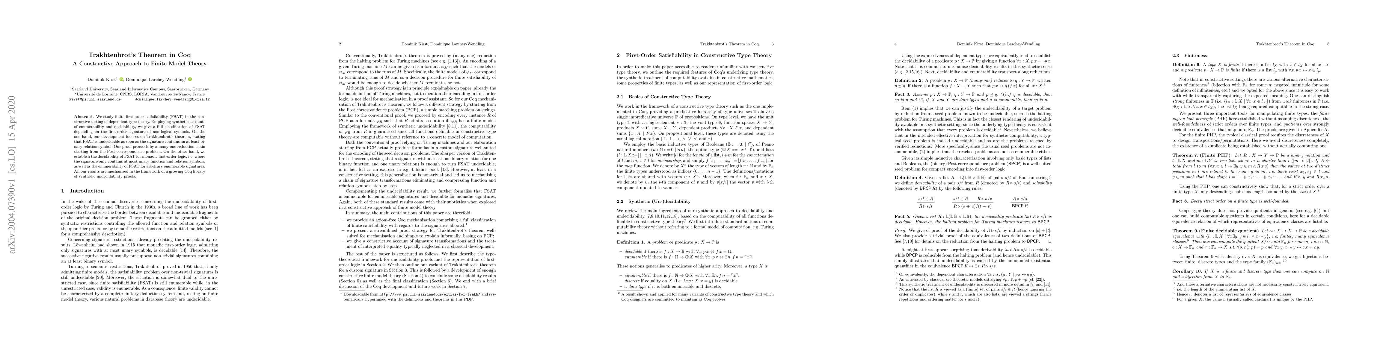 We study finite first-order satisfiability (FSAT) in the constructive setting of dependent type theory. Employing synthetic accounts of enumerability and decidability, we give a full classification of FSAT depending on the first-order signature of non-logical symbols. On the one hand, our development focuses on Trakhtenbrot's theorem, stating that FSAT is undecidable as soon as the signature contains an at least binary relation symbol. Our proof proceeds by a many-one reduction chain starting from the Post correspondence problem. On the other hand, we establish the decidability of FSAT for monadic first-order logic, i.e. where the signature only contains at most unary function and relation symbols, as well as the enumerability of FSAT for arbitrary enumerable signatures. All our results are mechanised in the framework of a growing Coq library of synthetic undecidability proofs.