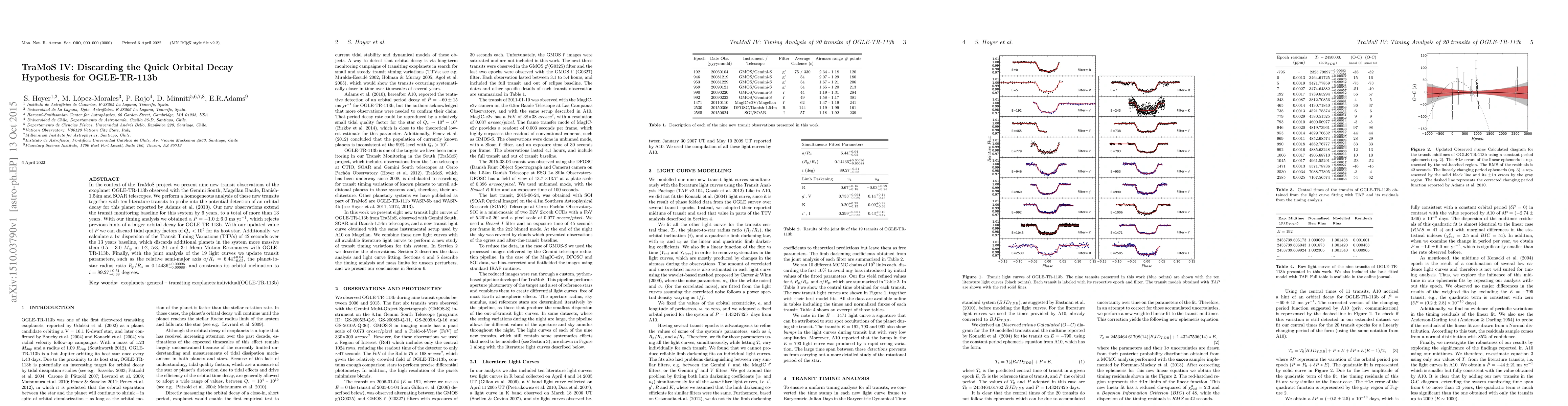In the context of the TraMoS project we present nine new transit observations of the exoplanet OGLE-TR-113b observed with the Gemini South, Magellan Baade, Danish-1.54m and SOAR telescopes. We perform a homogeneous analysis of these new transits together with ten literature transits to probe into the potential detection of an orbital decay for this planet reported by \citet{adams2010}. Our new observations extend the transit monitoring baseline for this system by 6 years, to a total of more than 13 years. With our timing analysis we obtained a $\dot{P}=-1.0 \pm 6.0$ ms~yr$^{-1}$, which rejects previous hints of a larger orbital decay for OGLE-TR-113b. With our updated value of $\dot{P}$ we can discard tidal quality factors of $Q_{\star} < 10^{5}$ for its host star. Additionally, we calculate a 1$\sigma$ dispersion of the Transit Timing Variations (TTVs) of 42 seconds over the 13 years baseline, which discards additional planets in the system more massive than $0.5-3.0~M_{\oplus}$ in 1:2, 5:3, 2:1 and 3:1 Mean Motion Resonances with OGLE-TR-113b. Finally, with the joint analysis of the 19 light curves we update transit parameters, such as the relative semi-major axis $a / R_s = 6.44^{+0.04}_{-0.05}$, the planet-to-star radius ratio $R_p / R_s =0.14436^{+0.00096}_{-0.00088}$, and constrains its orbital inclination to $i =89.27^{+0.51}_{-0.68}$~degrees.