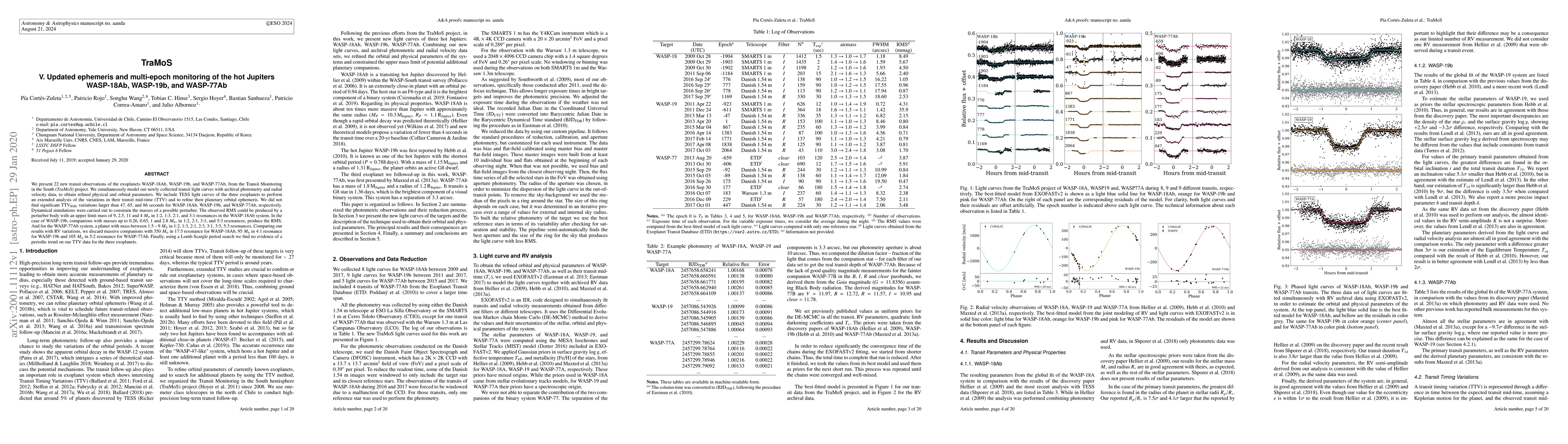 This paper reports new transit observations of the hot Jupiters WASP-18Ab, WASP-19b, and WASP-77Ab, refining their orbital parameters and ephemeris. The study finds no significant transit time variations (TTV) and constrains potential perturber masses in various resonances.