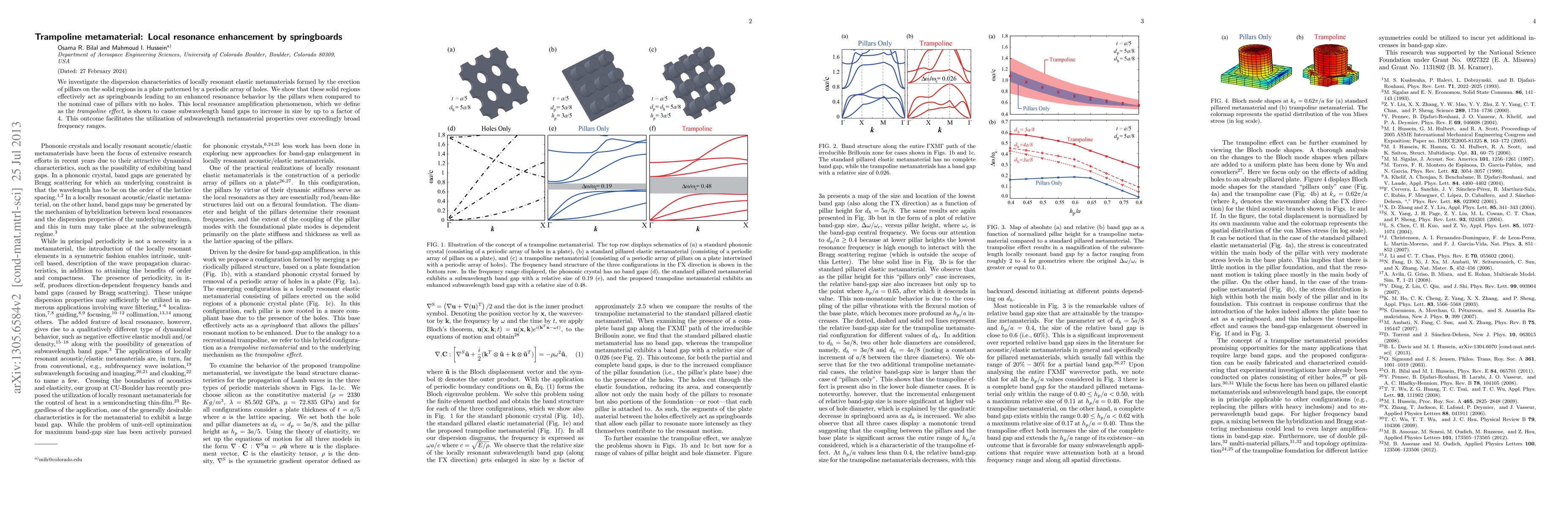 This paper explores how locally resonant elastic metamaterials, enhanced by pillars acting as springboards, exhibit a "trampoline effect" that amplifies resonance and increases subwavelength band gaps by up to four times, broadening their frequency range applications.
