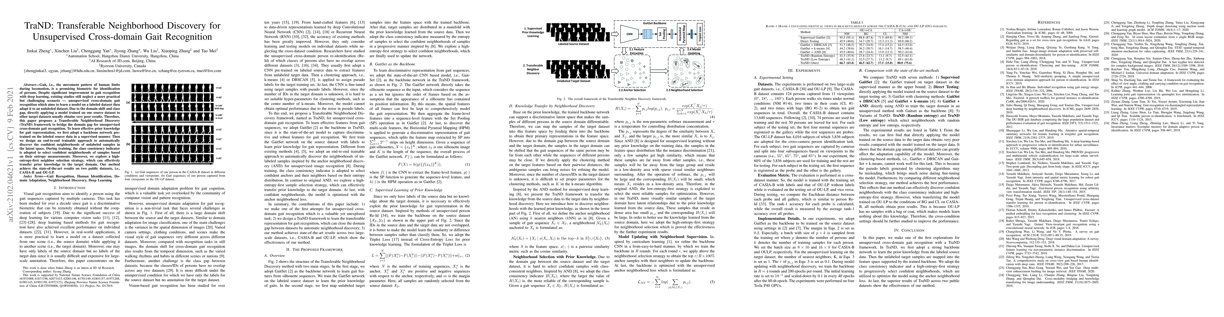 This paper introduces a Transferable Neighborhood Discovery (TraND) framework for unsupervised cross-domain gait recognition, aiming to bridge the domain gap by discovering confident neighborhoods in the latent space of unlabeled samples. The method achieves state-of-the-art results on CASIA-B and OU-LP datasets.