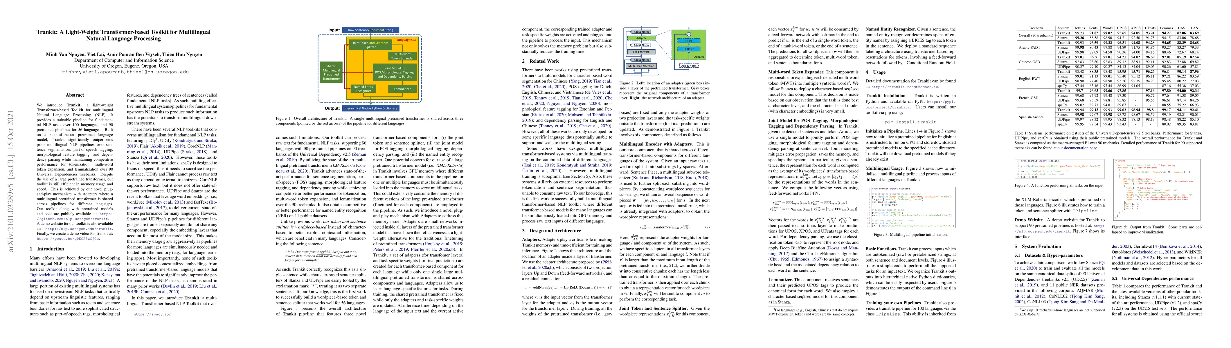 Trankit is a lightweight Transformer-based toolkit for multilingual NLP, offering pretrained pipelines and a trainable pipeline for 100 languages. It outperforms existing multilingual NLP pipelines in several tasks while maintaining efficiency.
