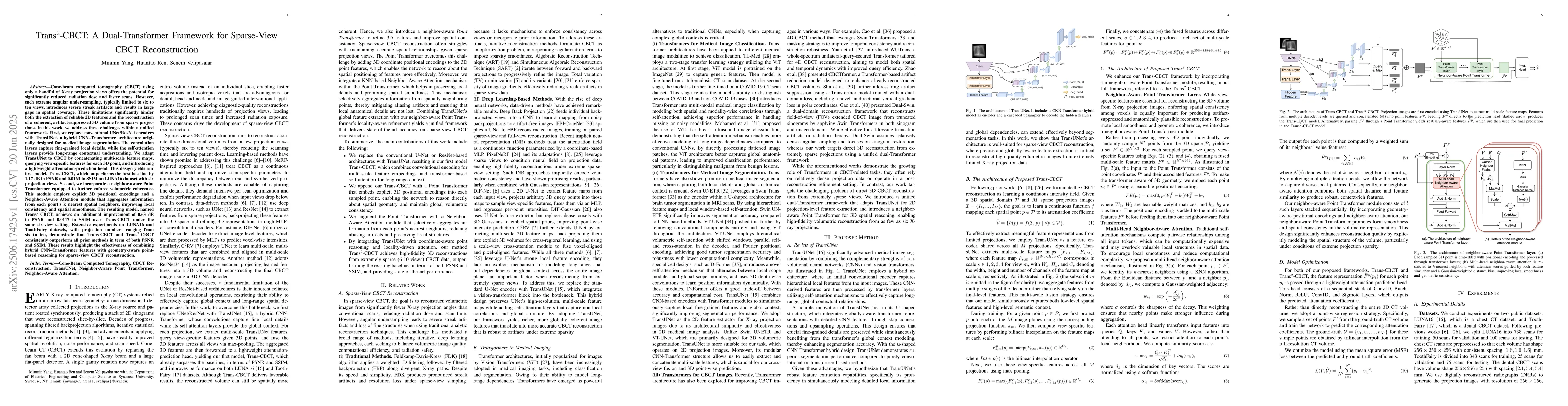 Cone-beam computed tomography (CBCT) using only a few X-ray projection views enables faster scans with lower radiation dose, but the resulting severe under-sampling causes strong artifacts and poor spatial coverage. We address these challenges in a unified framework. First, we replace conventional UNet/ResNet encoders with TransUNet, a hybrid CNN-Transformer model. Convolutional layers capture local details, while self-attention layers enhance global context. We adapt TransUNet to CBCT by combining multi-scale features, querying view-specific features per 3D point, and adding a lightweight attenuation-prediction head. This yields Trans-CBCT, which surpasses prior baselines by 1.17 dB PSNR and 0.0163 SSIM on the LUNA16 dataset with six views. Second, we introduce a neighbor-aware Point Transformer to enforce volumetric coherence. This module uses 3D positional encoding and attention over k-nearest neighbors to improve spatial consistency. The resulting model, Trans$^2$-CBCT, provides an additional gain of 0.63 dB PSNR and 0.0117 SSIM. Experiments on LUNA16 and ToothFairy show consistent gains from six to ten views, validating the effectiveness of combining CNN-Transformer features with point-based geometry reasoning for sparse-view CBCT reconstruction.