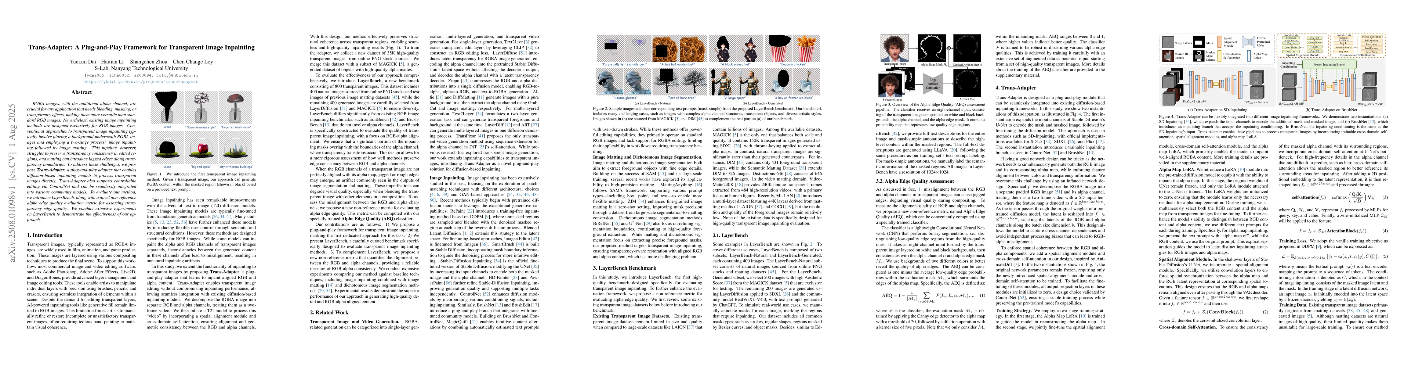 RGBA images, with the additional alpha channel, are crucial for any application that needs blending, masking, or transparency effects, making them more versatile than standard RGB images. Nevertheless, existing image inpainting methods are designed exclusively for RGB images. Conventional approaches to transparent image inpainting typically involve placing a background underneath RGBA images and employing a two-stage process: image inpainting followed by image matting. This pipeline, however, struggles to preserve transparency consistency in edited regions, and matting can introduce jagged edges along transparency boundaries. To address these challenges, we propose Trans-Adapter, a plug-and-play adapter that enables diffusion-based inpainting models to process transparent images directly. Trans-Adapter also supports controllable editing via ControlNet and can be seamlessly integrated into various community models. To evaluate our method, we introduce LayerBench, along with a novel non-reference alpha edge quality evaluation metric for assessing transparency edge quality. We conduct extensive experiments on LayerBench to demonstrate the effectiveness of our approach.