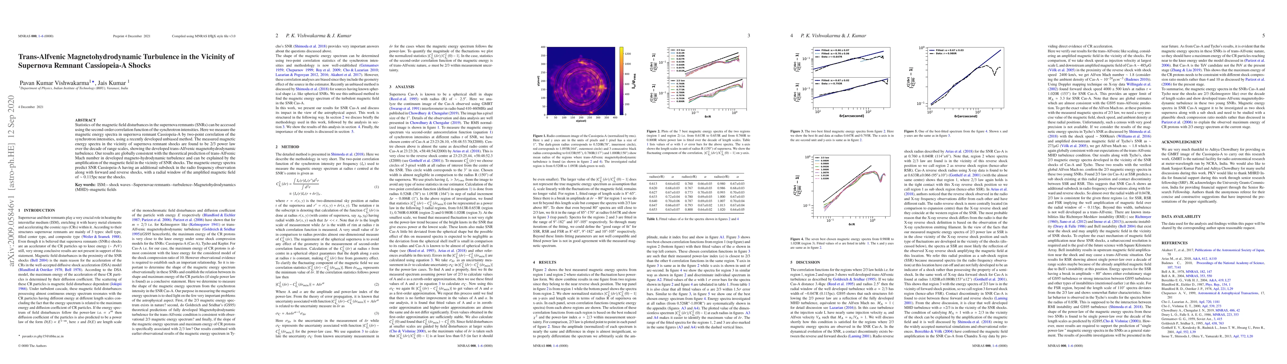 This study measures magnetic energy spectra in Cassiopeia-A using synchrotron intensity correlations, revealing a 2/3 power law indicative of trans-Alfvenic magnetohydrodynamic turbulence. The findings support theoretical predictions and suggest an additional subshock in the radio frequency observations.