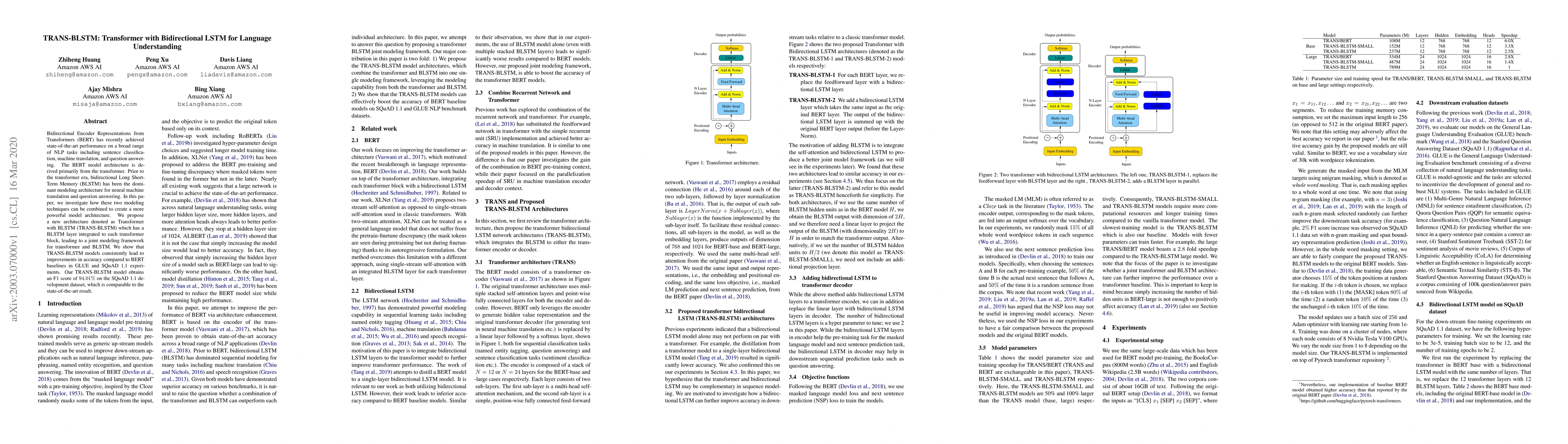 This paper proposes a new model architecture called TRANS-BLSTM, which combines the Transformer with a Bidirectional LSTM layer integrated into each transformer block. The results show consistent improvements over BERT baselines in GLUE and SQuAD 1.1, achieving an F1 score of 94.01% on the SQuAD 1.1 development dataset.