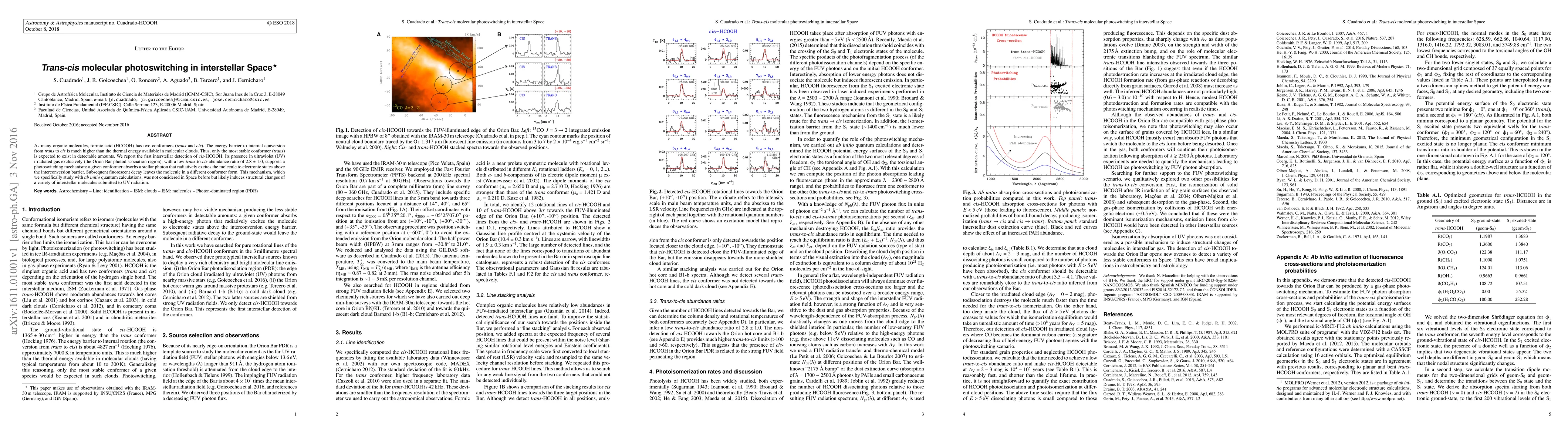 This paper reports the first detection of interstellar cis-formic acid (cis-HCOOH), challenging the expectation that only the more stable trans-form would exist in space. The presence of cis-HCOOH in UV-irradiated gas suggests a photoswitching mechanism, where UV photons excite the molecule, allowing it to overcome the energy barrier to convert from trans to cis.