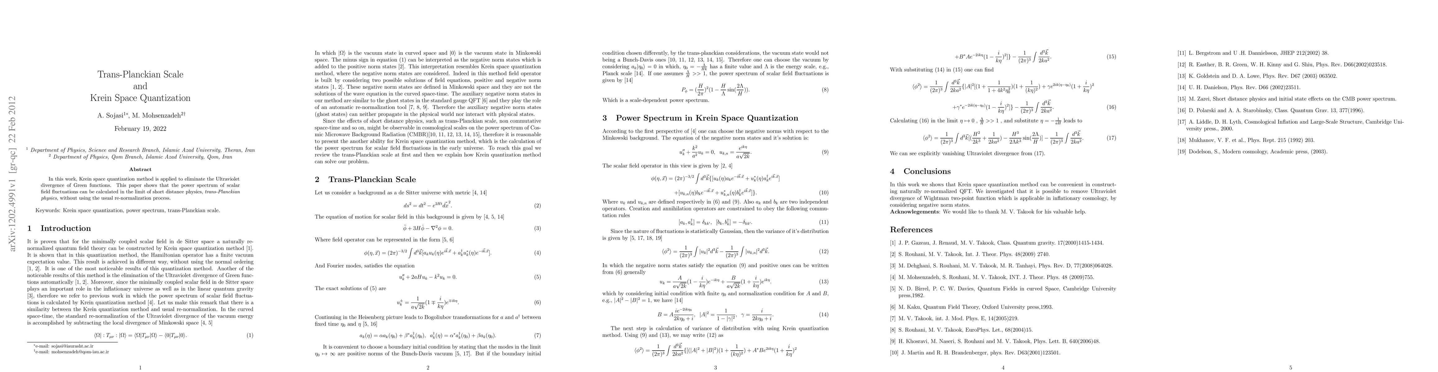 This paper applies Krein space quantization to resolve ultraviolet divergence in Green functions, demonstrating that scalar field fluctuations' power spectrum can be computed in trans-Planckian physics without traditional renormalization.
