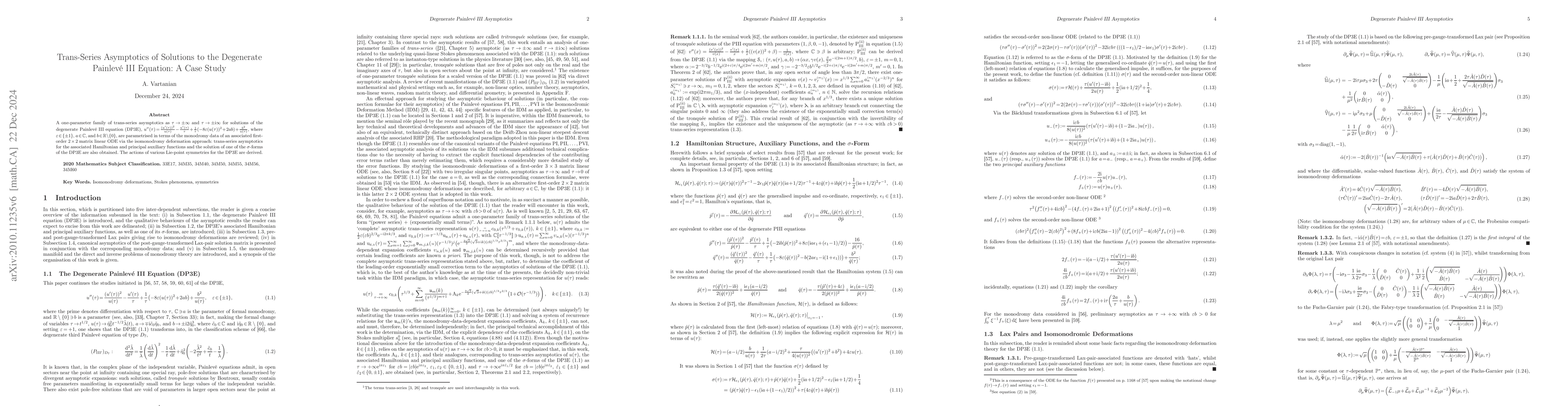 This paper develops a one-parameter family of trans-series asymptotics for solutions to the Degenerate Painlevé III Equation (DP3E) using the isomonodromy deformation method, and derives the actions of Lie-point symmetries for the DP3E.