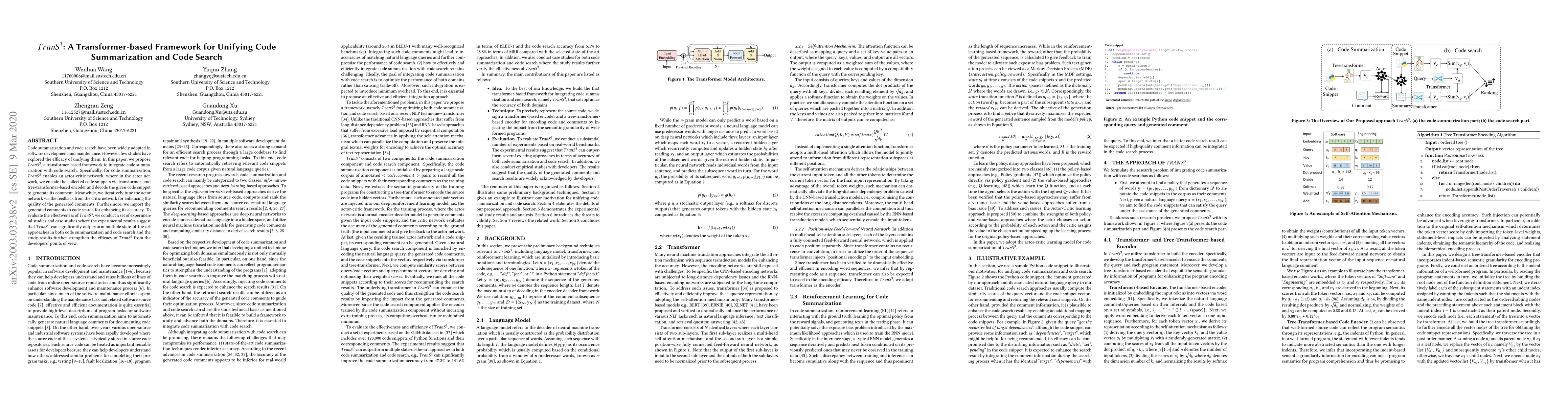 Code summarization and code search have been widely adopted in sofwaredevelopmentandmaintenance. However, fewstudieshave explored the efcacy of unifying them. In this paper, we propose TranS^3 , a transformer-based framework to integrate code summarization with code search. Specifcally, for code summarization,TranS^3 enables an actor-critic network, where in the actor network, we encode the collected code snippets via transformer- and tree-transformer-based encoder and decode the given code snippet to generate its comment. Meanwhile, we iteratively tune the actor network via the feedback from the critic network for enhancing the quality of the generated comments. Furthermore, we import the generated comments to code search for enhancing its accuracy. To evaluatetheefectivenessof TranS^3 , we conduct a set of experimental studies and case studies where the experimental results suggest that TranS^3 can signifcantly outperform multiple state-of-the-art approaches in both code summarization and code search and the study results further strengthen the efcacy of TranS^3 from the developers' points of view.