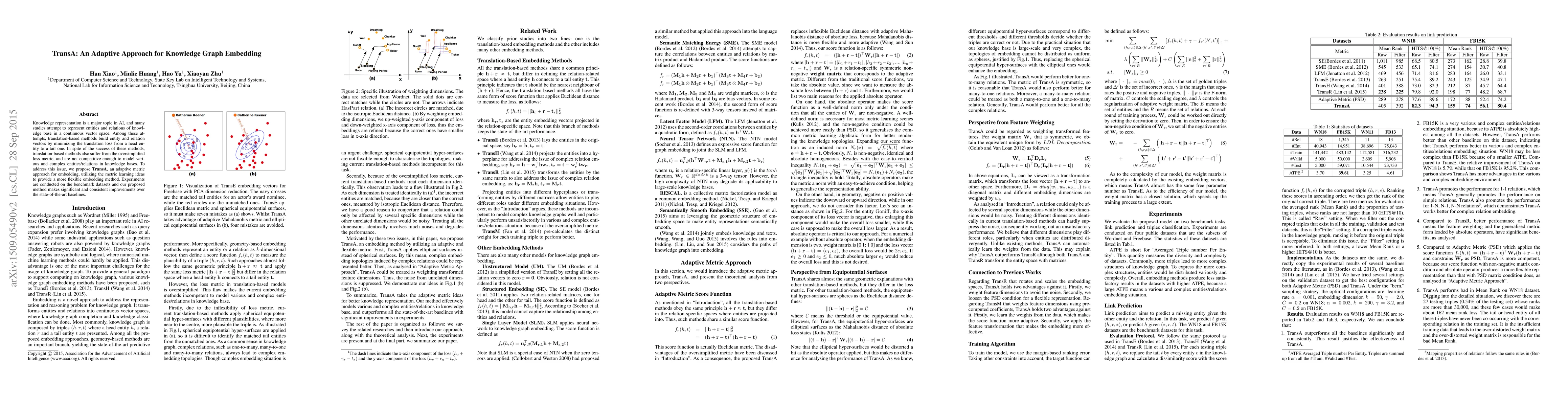 TransA introduces an adaptive metric approach for knowledge graph embedding, addressing the limitations of translation-based methods by incorporating metric learning for more flexible entity and relation representations. Experimental results show significant improvements over existing state-of-the-art baselines.