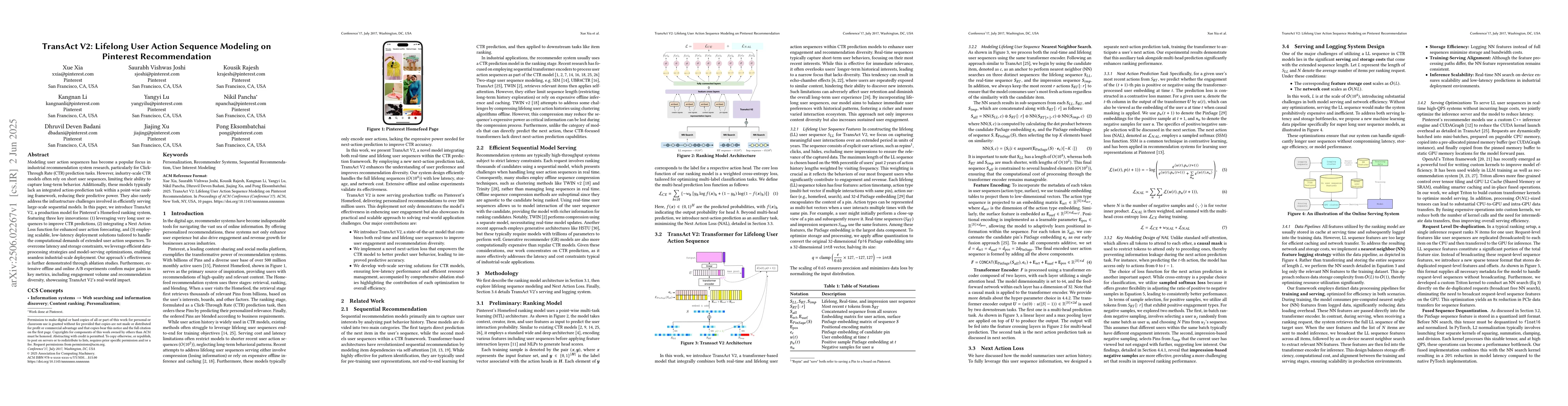 The paper presents TransAct V2, a model for Pinterest's recommendation system. It introduces three main improvements: utilizing extensive user action sequences for better CTR predictions, incorporating a Next Action Loss function for enhanced action forecasting, and deploying scalable, low-latency solutions for handling large-scale sequential data.