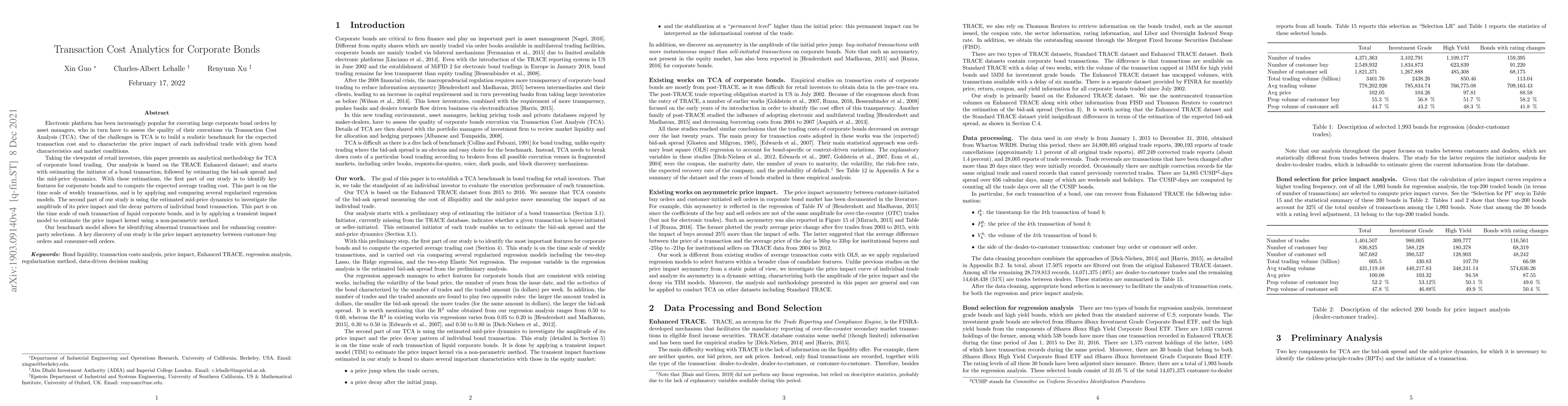 The electronic platform has been increasingly popular for executing large corporate bond orders by asset managers, who in turn have to assess the quality of their executions via Transaction Cost Analysis (TCA). One of the challenges in TCA is to build a realistic benchmark for the expected transaction cost and to characterize the price impact of each individual trade with given bond characteristics and market conditions. Taking the viewpoint of retail investors, this paper presents an analytical methodology for TCA of corporate bond trading. Our analysis is based on the TRACE Enhanced dataset; and starts with estimating the initiator of a bond transaction, followed by estimating the bid-ask spread and the mid-price dynamics. With these estimations, the first part of our study is to identify key features for corporate bonds and to compute the expected average trading cost. This part is on the time scale of weekly transactions, and is by applying and comparing several regularized regression models. The second part of our study is using the estimated mid-price dynamics to investigate the amplitude of its price impact and the decay pattern of individual bond transaction. This part is on the time scale of each transaction of liquid corporate bonds, and is by applying a transient impact model to estimate the price impact kernel using a non-parametric method. Our benchmark model allows for identifying abnormal transactions and for enhancing counter-party selections. A key discovery of our study is the price impact asymmetry between customer-buy orders and consumer-sell orders.