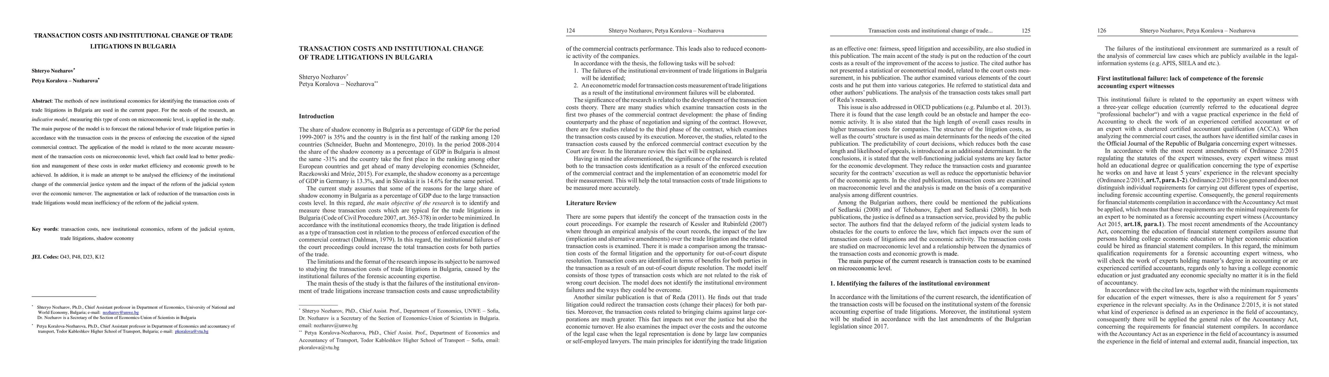 The methods of new institutional economics for identifying the transaction costs of trade litigations in Bulgaria are used in the current paper. For the needs of the research, an indicative model, measuring this type of costs on microeconomic level, is applied in the study. The main purpose of the model is to forecast the rational behavior of trade litigation parties in accordance with the transaction costs in the process of enforcing the execution of the signed commercial contract. The application of the model is related to the more accurate measurement of the transaction costs on microeconomic level, which fact could lead to better prediction and management of these costs in order market efficiency and economic growth to be achieved. In addition, it is made an attempt to be analysed the efficiency of the institutional change of the commercial justice system and the impact of the reform of the judicial system over the economic turnover. The augmentation or lack of reduction of the transaction costs in trade litigations would mean inefficiency of the reform of the judicial system. JEL Codes: O43, P48, D23, K12
