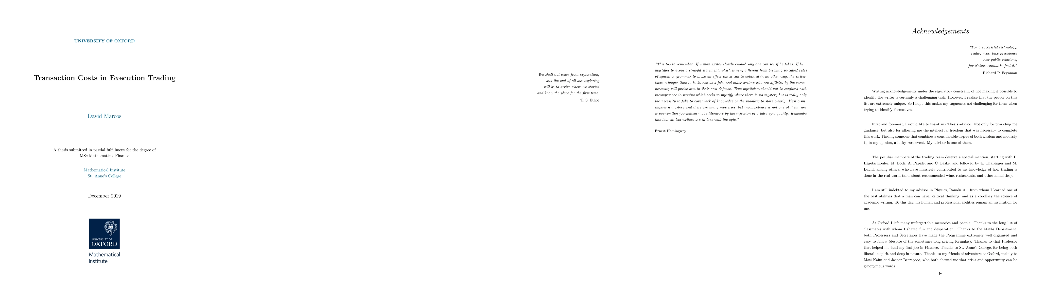 This paper develops a formalism for optimal execution trading that balances market impact and timing risk, modeled through negative transaction costs. It builds on existing optimal trading strategies and incorporates distinctive execution strategies, analyzing various impact models and market return distributions.