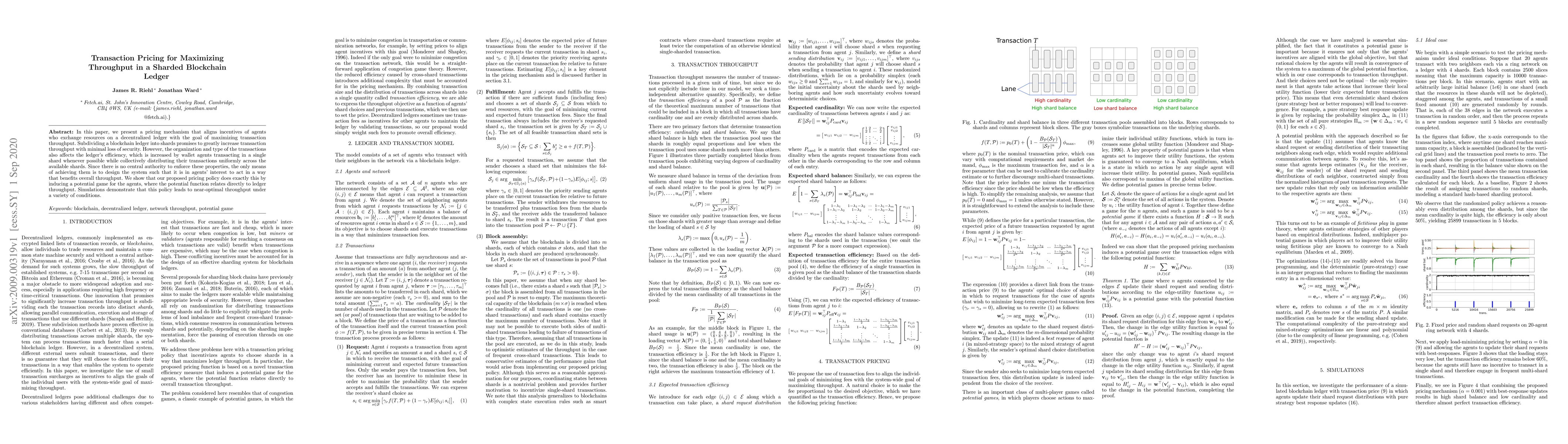 This paper proposes a pricing mechanism to maximize transaction throughput in sharded blockchain ledgers by aligning agents' incentives to transact efficiently. The mechanism creates a potential game that incentivizes agents to distribute their transactions uniformly across shards, thereby optimizing overall throughput. Simulation results show near-optimal throughput performance under various conditions.