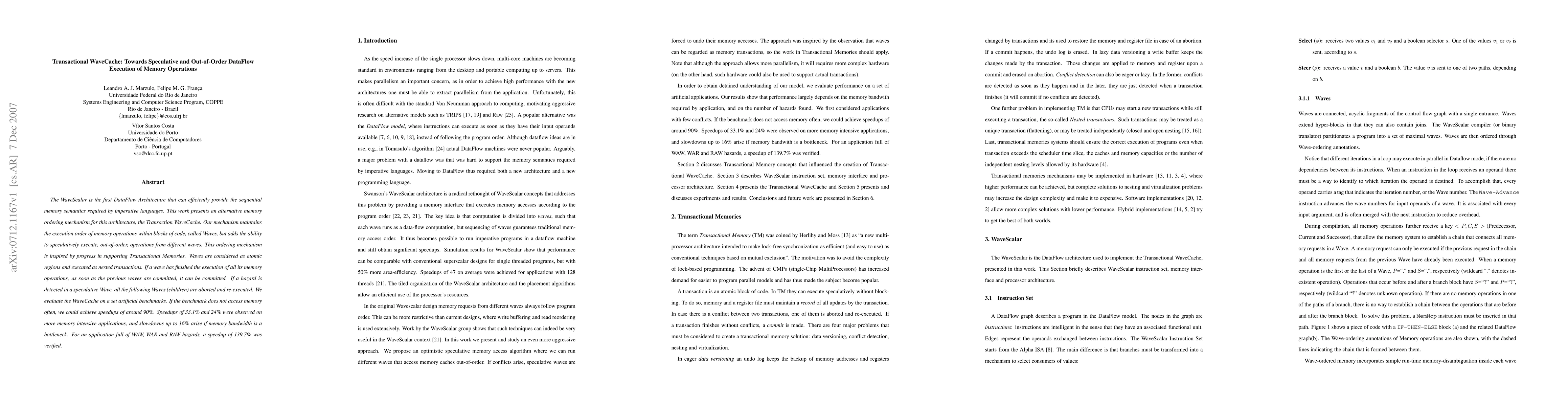 The WaveScalar is the first DataFlow Architecture that can efficiently provide the sequential memory semantics required by imperative languages. This work presents an alternative memory ordering mechanism for this architecture, the Transaction WaveCache. Our mechanism maintains the execution order of memory operations within blocks of code, called Waves, but adds the ability to speculatively execute, out-of-order, operations from different waves. This ordering mechanism is inspired by progress in supporting Transactional Memories. Waves are considered as atomic regions and executed as nested transactions. If a wave has finished the execution of all its memory operations, as soon as the previous waves are committed, it can be committed. If a hazard is detected in a speculative Wave, all the following Waves (children) are aborted and re-executed. We evaluate the WaveCache on a set artificial benchmarks. If the benchmark does not access memory often, we could achieve speedups of around 90%. Speedups of 33.1% and 24% were observed on more memory intensive applications, and slowdowns up to 16% arise if memory bandwidth is a bottleneck. For an application full of WAW, WAR and RAW hazards, a speedup of 139.7% was verified.