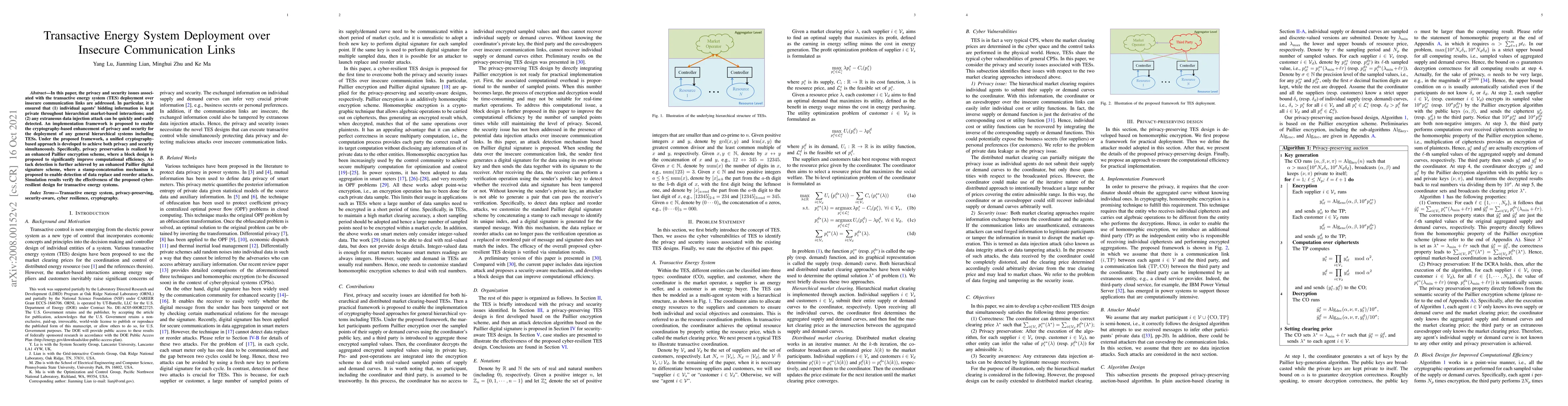 In this paper, the privacy and security issues associated with the transactive energy system (TES) deployment over insecure communication links are addressed. In particular, it is ensured that (1) individual agents' bidding information is kept private throughout hierarchical market-based interactions; and (2) any extraneous data injection attack can be quickly and easily detected. An implementation framework is proposed to enable the cryptography-based enhancement of privacy and security for the deployment of any general hierarchical systems including TESs. Under the proposed framework, a unified cryptography-based approach is developed to achieve both privacy and security simultaneously. Specifically, privacy preservation is realized by an enhanced Paillier encryption scheme, where a block design is proposed to significantly improve computational efficiency. Attack detection is further achieved by an enhanced Paillier digital signature scheme, where a stamp-concatenation mechanism is proposed to enable detection of data replace and reorder attacks. Simulation results verify the effectiveness of the proposed cyber-resilient design for transactive energy systems.