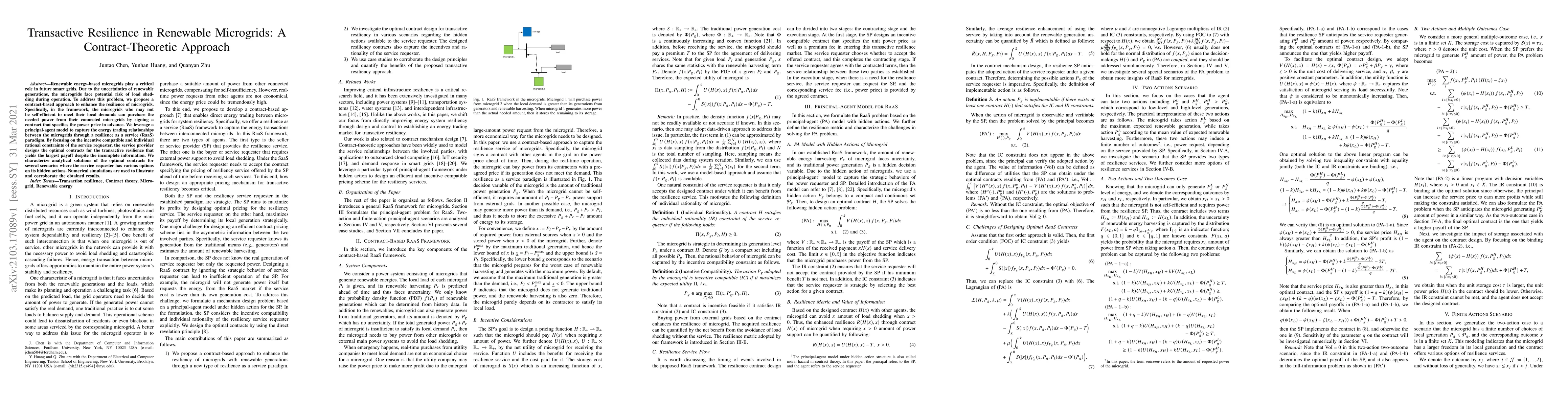 This paper proposes a contract-based approach to enhance the resilience of renewable energy-based microgrids through a principal-agent model. The method allows less self-efficient microgrids to purchase power from connected ones via advanced contracts, ensuring optimal resilience despite uncertainties and incomplete information.