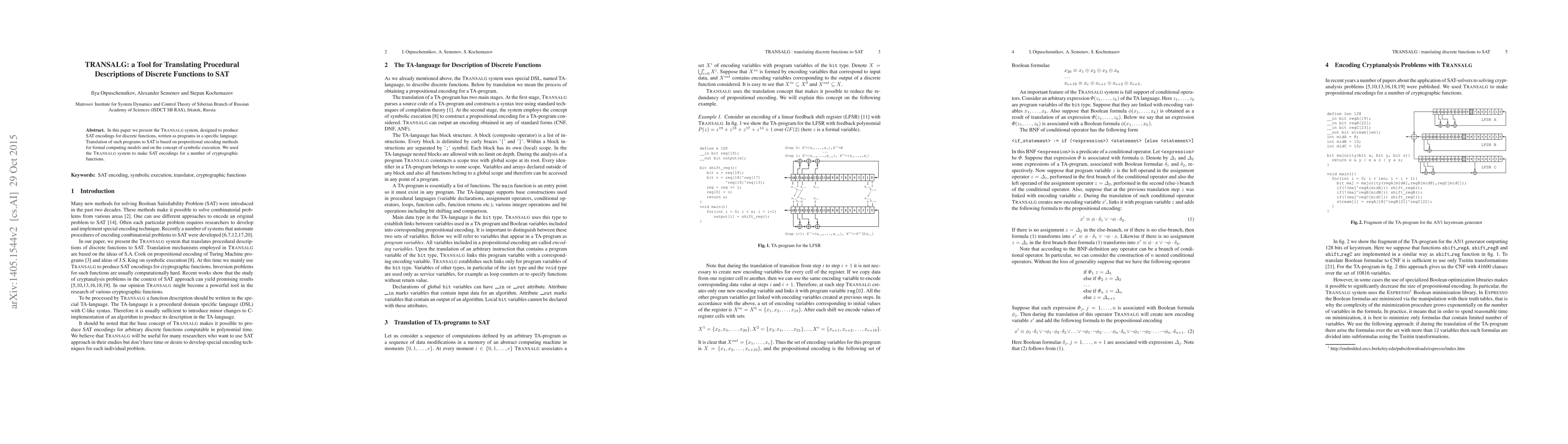 Transalg is a tool that translates procedural descriptions of discrete functions into SAT encodings using propositional encoding and symbolic execution. The system was applied to generate SAT encodings for various cryptographic functions.
