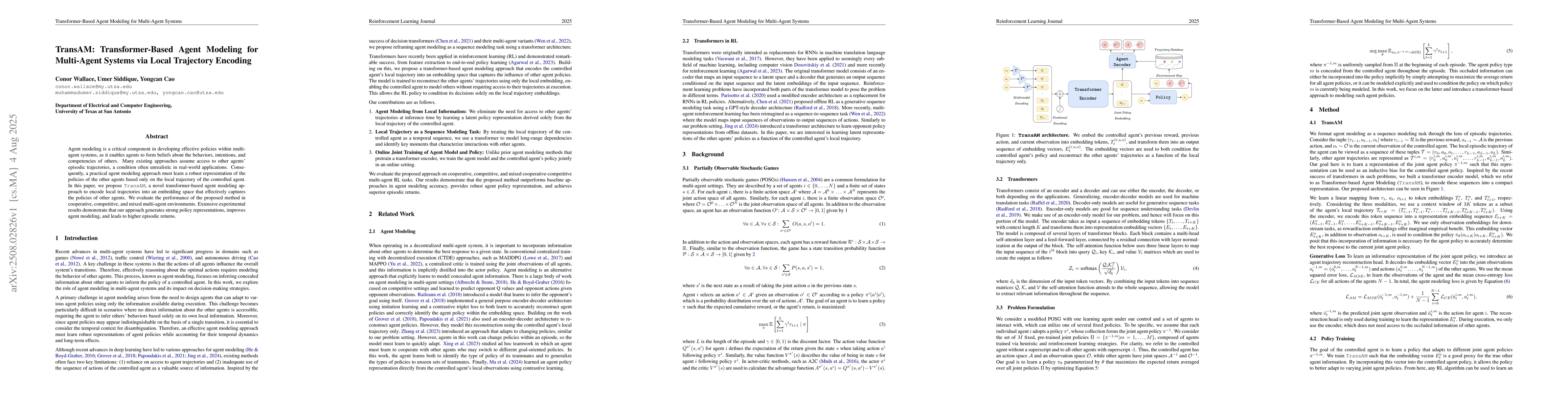 Agent modeling is a critical component in developing effective policies within multi-agent systems, as it enables agents to form beliefs about the behaviors, intentions, and competencies of others. Many existing approaches assume access to other agents' episodic trajectories, a condition often unrealistic in real-world applications. Consequently, a practical agent modeling approach must learn a robust representation of the policies of the other agents based only on the local trajectory of the controlled agent. In this paper, we propose \texttt{TransAM}, a novel transformer-based agent modeling approach to encode local trajectories into an embedding space that effectively captures the policies of other agents. We evaluate the performance of the proposed method in cooperative, competitive, and mixed multi-agent environments. Extensive experimental results demonstrate that our approach generates strong policy representations, improves agent modeling, and leads to higher episodic returns.
