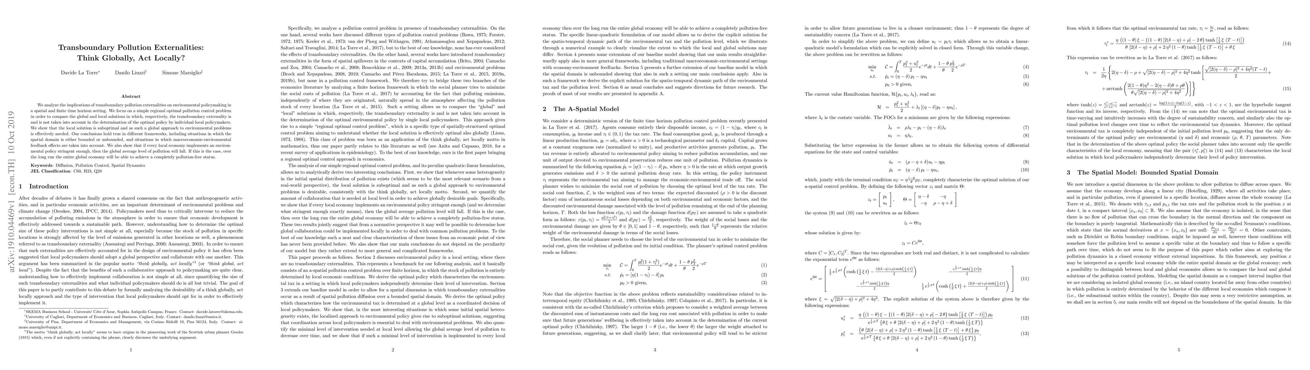 We analyze the implications of transboundary pollution externalities on environmental policymaking in a spatial and finite time horizon setting. We focus on a simple regional optimal pollution control problem in order to compare the global and local solutions in which, respectively, the transboundary externality is and is not taken into account in the determination of the optimal policy by individual local policymakers. We show that the local solution is suboptimal and as such a global approach to environmental problems is effectively needed. Our conclusions hold true in different frameworks, including situations in which the spatial domain is either bounded or unbounded, and situations in which macroeconomic-environmental feedback effects are taken into account. We also show that if every local economy implements an environmental policy stringent enough, then the global average level of pollution will fall. If this is the case, over the long run the entire global economy will be able to achieve a completely pollution-free status.