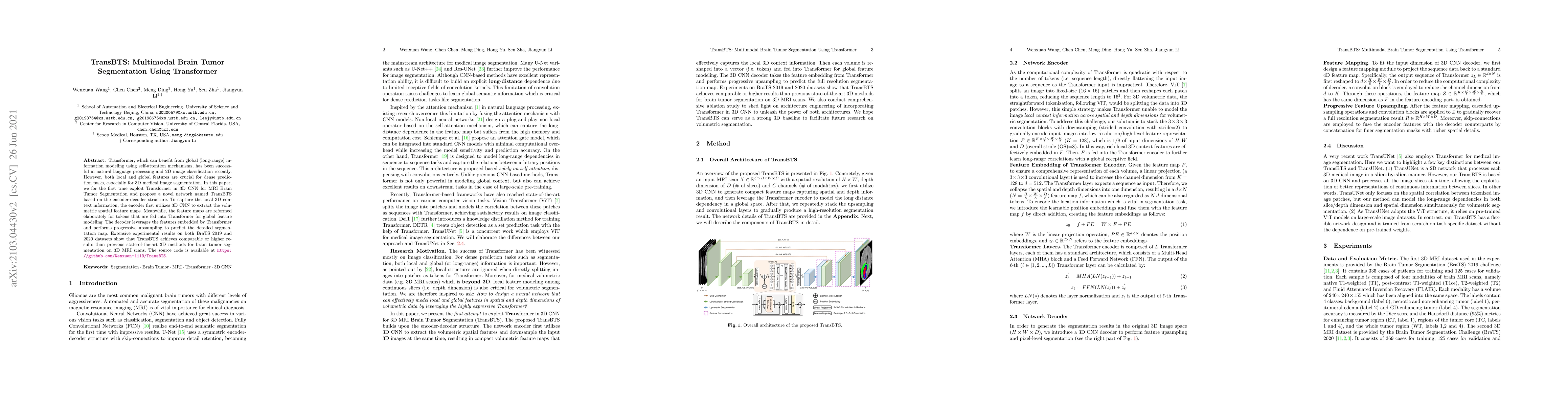 This paper introduces TransBTS, a novel network combining Transformer and 3D CNN for brain tumor segmentation in MRI scans. It uses 3D CNN for local feature extraction and Transformer for global feature modeling, achieving competitive results on BraTS datasets.