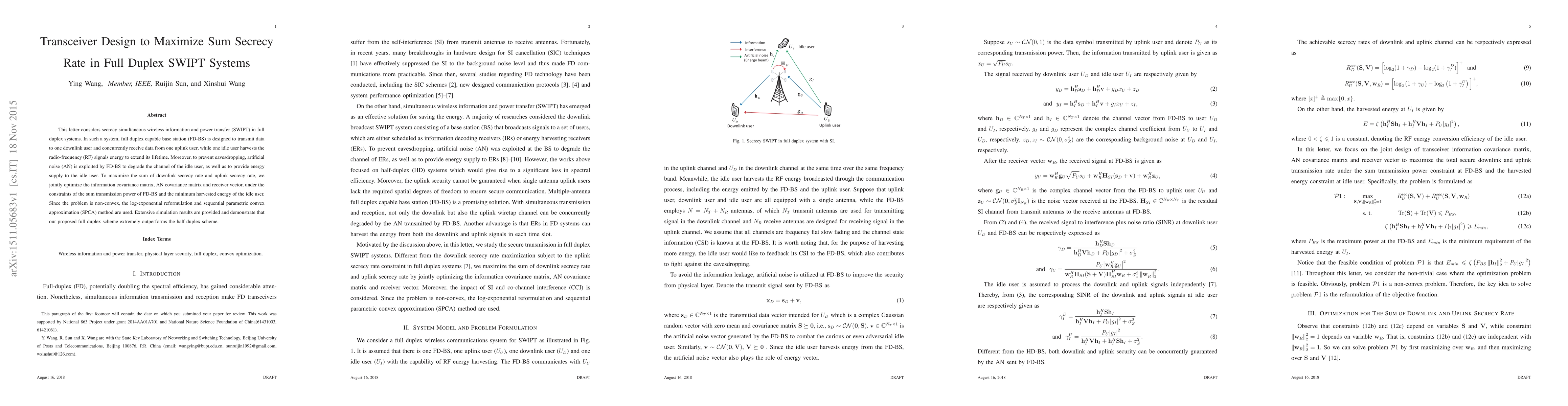 This paper proposes a transceiver design for maximizing the sum secrecy rate in full duplex SWIPT systems, optimizing the information and artificial noise covariance matrices to enhance security and energy efficiency. The non-convex optimization problem is solved using log-exponential reformulation and SPCA, showing significant performance improvements over half duplex schemes.